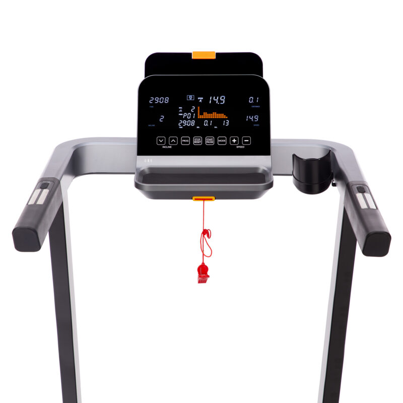 Das Laufband BE5873 verfügt über einen Computer mit LCD-Display, der bis zu 36 vorprogrammierte Trainingsprogramme, 3 Benutzerprogramme und 1 manuelles Programm bietet. Eingebaute Sensoren zur Messung von Zeit, Strecke, Geschwindigkeit, Kalorien und Puls sowie eine Körperfettanalysefunktion helfen Ihnen, Ihre Fortschritte zu überwachen und die Intensität Ihres Trainings an Ihre individuellen Bedürfnisse anzupassen. Mit den Geschwindigkeits- und Neigungsreglern an den Griffen können Sie Ihre Trainingsparameter schnell und bequem einstellen, ohne Ihr Training zu unterbrechen.