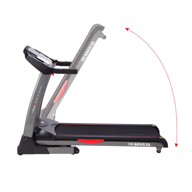 Die breite Steuerkonsole mit einem großen Computerbildschirm ermöglicht es Ihnen, bequem die Einstellungen zu ändern. Besonders nützlich erweisen sich die Tasten der schnellen Auswahl von Geschwindigkeits- und Neigungswinkelprogrammen. Der Computer verfügt über 99 Programme und einen Touch-Bildschirm. Das Laufband HMS BE8535 zeichnet sich durch den breiten Verstellungsbereich des Neigungswinkels vom Laufbandgurt und der Geschwindigkeiten aus, die es Ihnen ermöglichen, abwechslungsreiche Trainings durchzuführen. Mit der Möglichkeit des Bluetooth-Anschlusses sowie den integrierten Lautsprechern lässt sich das Training bei den Musikklängen machen. Dadurch hält man den Rhythmus und trainiert pausenlos. Mit dem einfachen Klappsystem ist das Laufband sehr platzsparend. Für die Erhöhung der Sicherheit beim Zusammenklappen des Laufbands wurden 2 zusätzliche Gasdämpfer montiert, die die Absenkung des Laufbands verlangsamen.