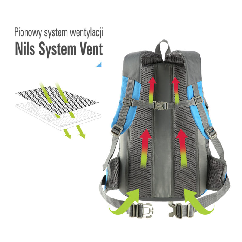 Dank dem Nils-Vent-System sind lange Wanderungen kein Problem. Das Rückenteil, die Schultergurte und der Hüftgurt sind mit speziellem Netz gesäumt, damit der Körper nicht direkt mit dem Material in Berührung kommt, was sich positiv auf die Durchblutung auswirkt und Schwitzen verhindert.