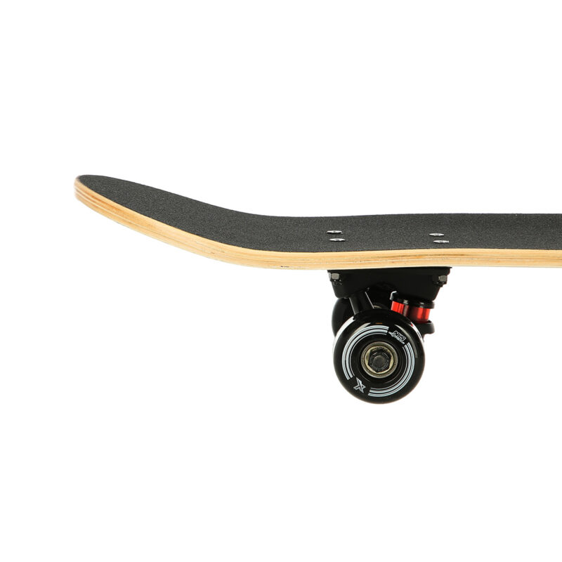 Das Skateboard besteht aus 9-schichtigem laminiertem Sperrholz. Es ist speziell zusätzlich verstärkt, profiliert und poliert, was hohe Widerstandsfähigkeit samt der Elastizität gewährleistet. Sein Oberteil ist mit Schleifpapier (sog. Grip) bedeckt. Dies gibt Ihnen einen sicheren Stand.