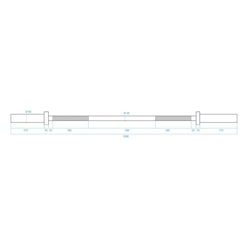 Ein sicheres und bequemes Greifen der Langhantelstange wurde durch sorgfältiges Rändeln gewährleistet. Maximale Belastung beträgt 160 Kilogramm. Der Durchmesser des Greifteils, der 28 mm beträgt, gewährleistet große Widerstandsfähigkeit und den Komfort während des Trainings.