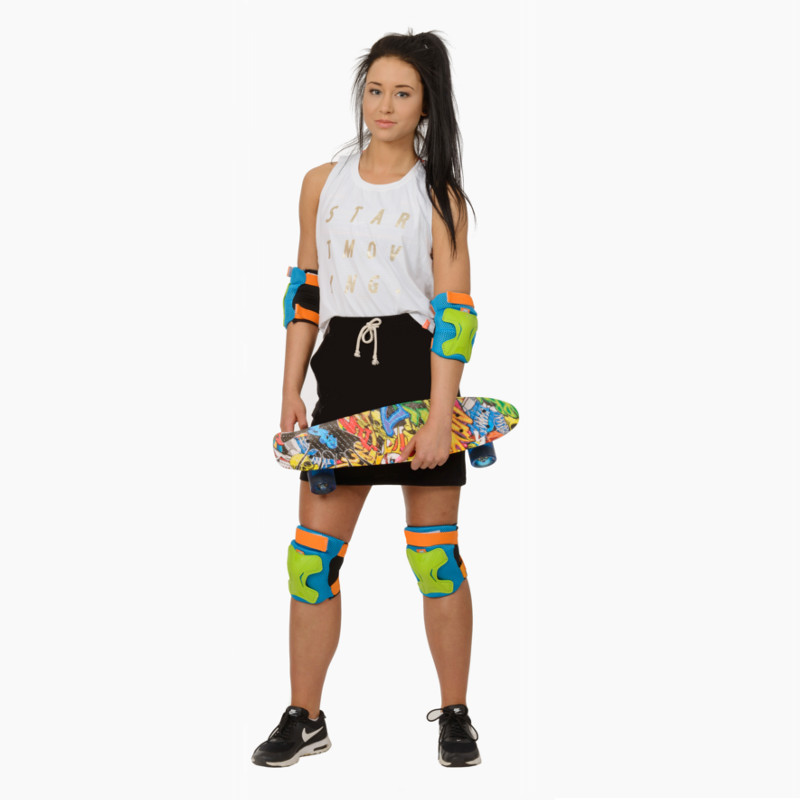 Die Schale der Schützer wurde aus festem und leichtem Kunststoff hergestellt. Die weiche Schicht besteht hingegen aus Schaumstoff mit hoher Dichte und aus atmungsaktiver Membrane Mesh 3D. Alle Schützer sind mit einem Klettverschluss ausgestattet. Außerdem haben die Ellenbogen- und Knieschützer elastische Bänder. Daher ändern sie ihre Position beim Training nicht und schränken die Bewegung nicht ein.