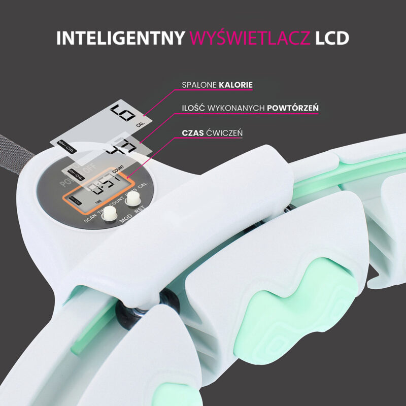 Man kann schnell und bequem die Größe des Reifens verkleinern oder vergrößern. Es reicht nur, Elemente entsprechend den Bedürfnissen zu entfernen oder hinzuzufügen. Die Größe kann man zwischen 12 und 16 Elementen einstellen. Der Taillenumfang kann dementsprechend von 76 cm bis zum 111,5 cm betragen (Durchmesser des Kreises: 34 – 45 cm).
