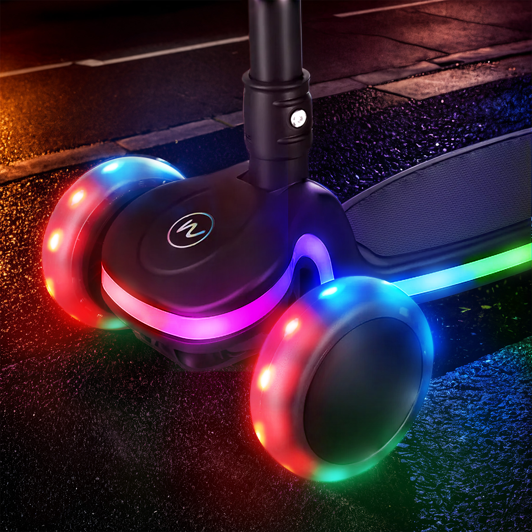 Die Trittfläche des Scooters misst 59 x 13,5 cm und bietet Ihrem Kind genügend Platz, um die Füße fest auf dem Boden abzustellen. Darüber hinaus verfügt der Scooter über eine glänzende Trittfläche mit Lichteffekt , die ihm ein einzigartiges Aussehen verleiht und die Sichtbarkeit beim Fahren erhöht.