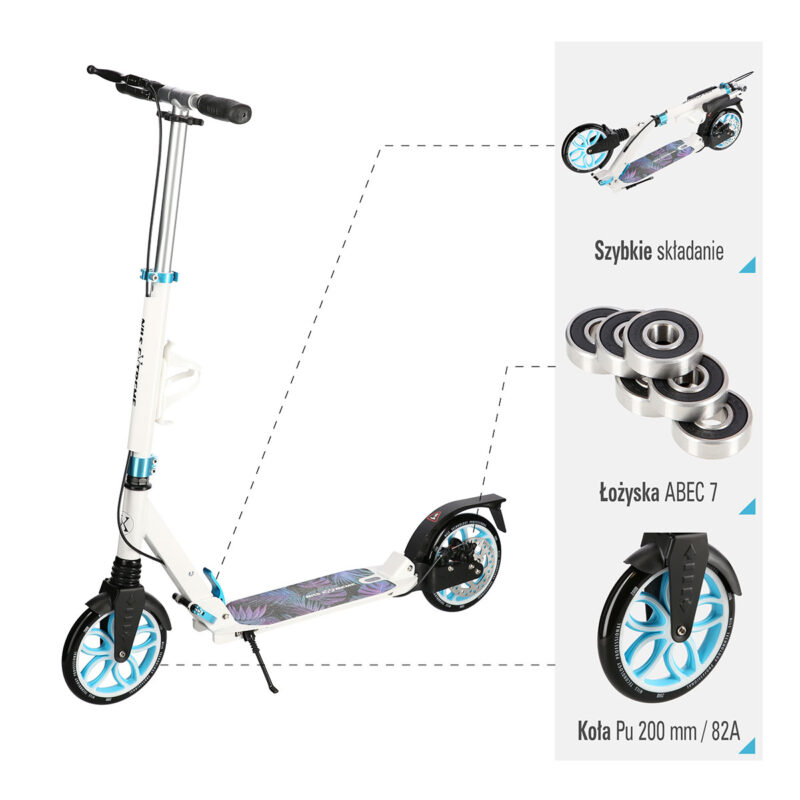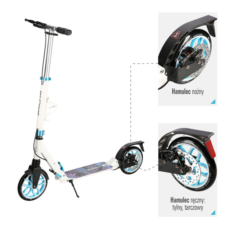 Der Roller hat zusätzlich eine Scheibenbremse, die sich auf dem hinteren Rad befindet. Mit dieser Lösung erhöht man deutlich die Bremskraft im Vergleich mit einer klassischen Fußbremse. Die Position der Bremse an der Lenkerstange trägt dazu bei, dass sie intuitiver als Fußbremse zu benutzen ist und der Fahrer kann sofort bei Bedarf reagieren. Am wichtigsten ist auch hier die Sicherheit beim Fahren sogar auf nassen Oberflächen. Für die Sicherheit des Produkts sorgen zusätzlich die Schutzbleche, die vor Schmutz schützen, und das rutschfeste Trittbrett, das eine stabile Position beim Fahren bietet. Außerdem ist der Lenker mit Gummi-Griffen ausgestattet, die einen sicheren Halt gewährleisten und keine Schürfwunden verursachen.