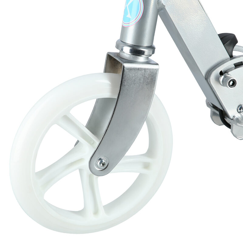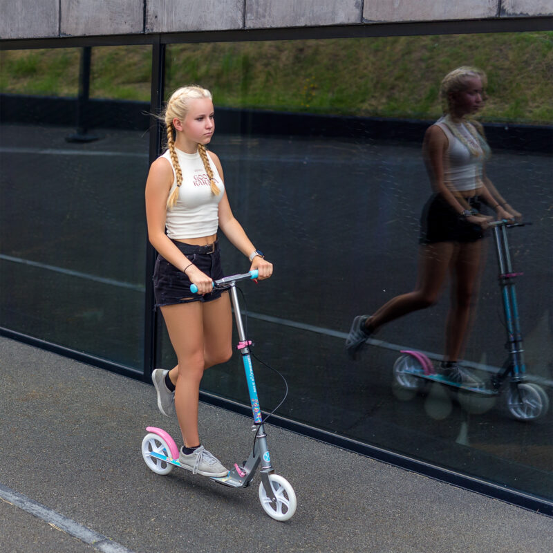 Der Lenker wurde mit Gummi-Griffen ausgestattet, die das sichere Greifen gewährleisten und keine Schürfwunden verursachen. Solche Lösung sorgt für Ihre stundenlange Freude beim Fahren. Die Verstellung des Lenkers ermöglicht es Ihnen, die Höhe des Lenkers an Ihre Körpergröße anzupassen. Der Roller HM220 hat zwei große Räder. Dies ermöglicht ein effizientes Steuern des Rollers und ein leichteres Überwinden von Unebenheiten. Die Lager der Klasse ABEC7 verbessern die Stabilität und garantieren eine reibungslose Fahrt.