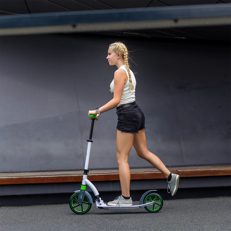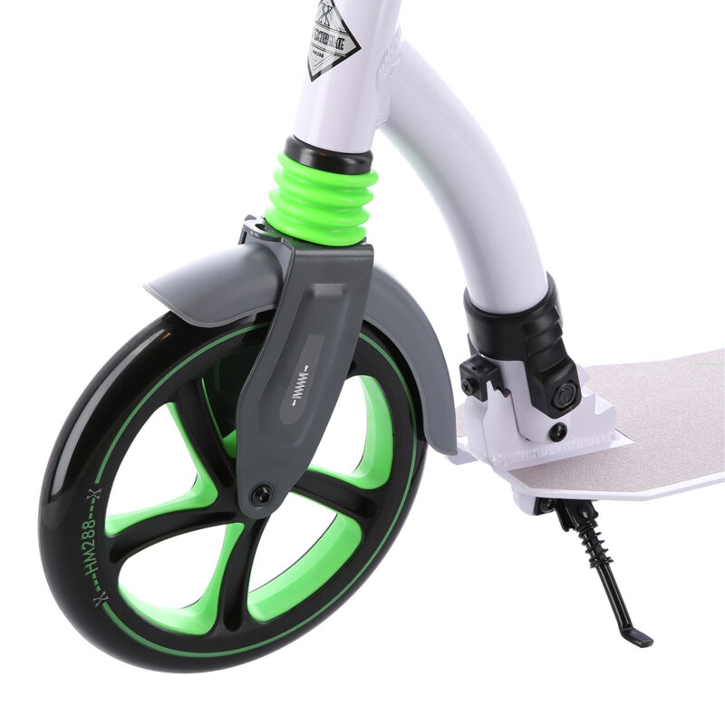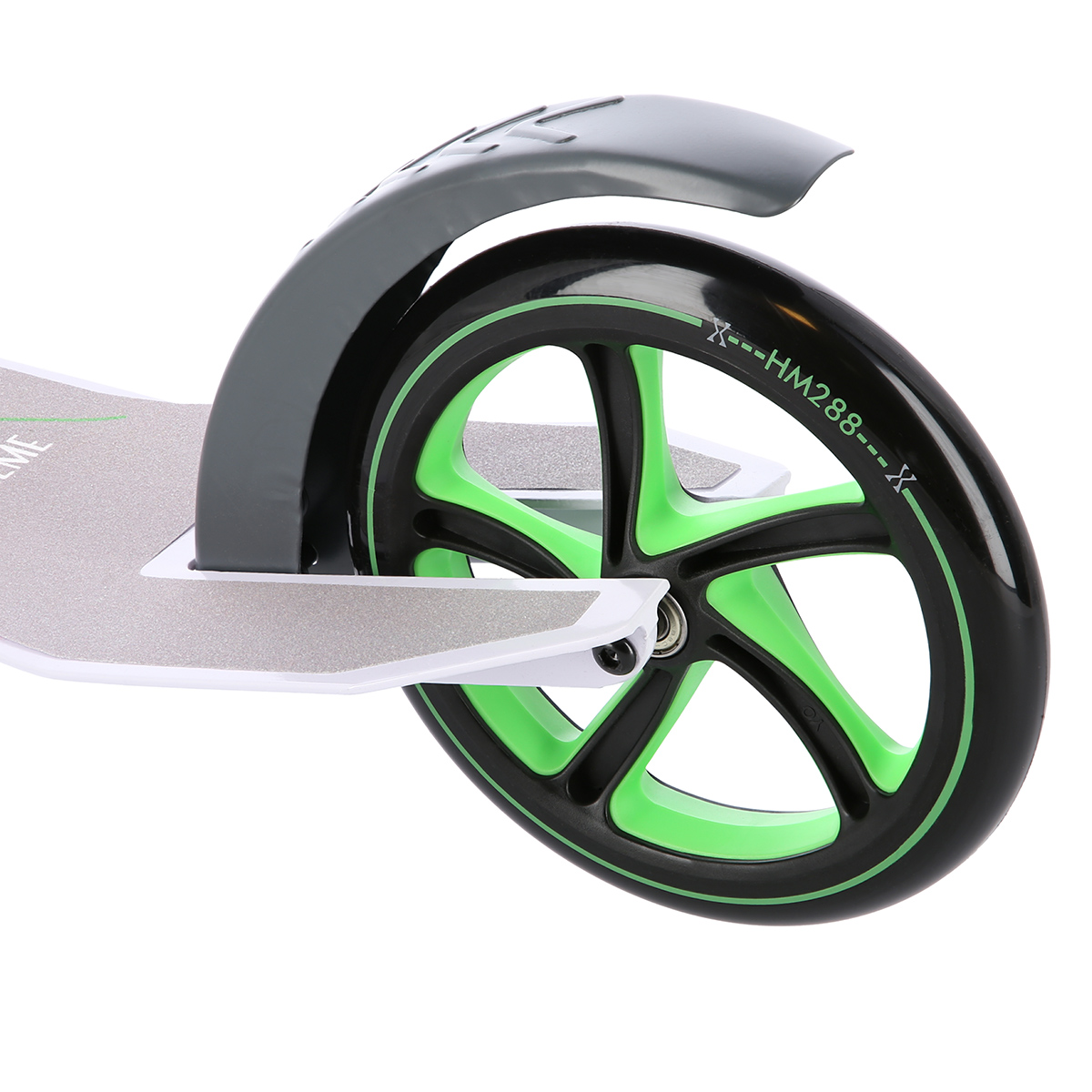 Der Lenker wurde mit Gummi-Griffen ausgestattet, die das sichere Greifen gewährleisten und keine Schürfwunden verursachen. Solche Lösung sorgt für Ihre stundenlange Freude beim Fahren. Die Verstellung des Lenkers ermöglicht es Ihnen, die Höhe des Lenkers an Ihre Körpergröße anzupassen. Der Roller HM228 hat zwei große Räder. Die Größe des Vorderrads beträgt 230 mm. Dies ermöglicht ein effizientes Steuern des Rollers und ein leichteres Überwinden von Unebenheiten. Dieses Modell ist auch mit einem vorderen Stoßdämpfer ausgestattet, der Schwingungen dämpft und Stöße absorbiert. Die Lager der Klasse ABEC9 verbessern die Stabilität und garantieren eine reibungslose Fahrt. Die hintere Fußbremse sorgt hingegen für Ihre Sicherheit.