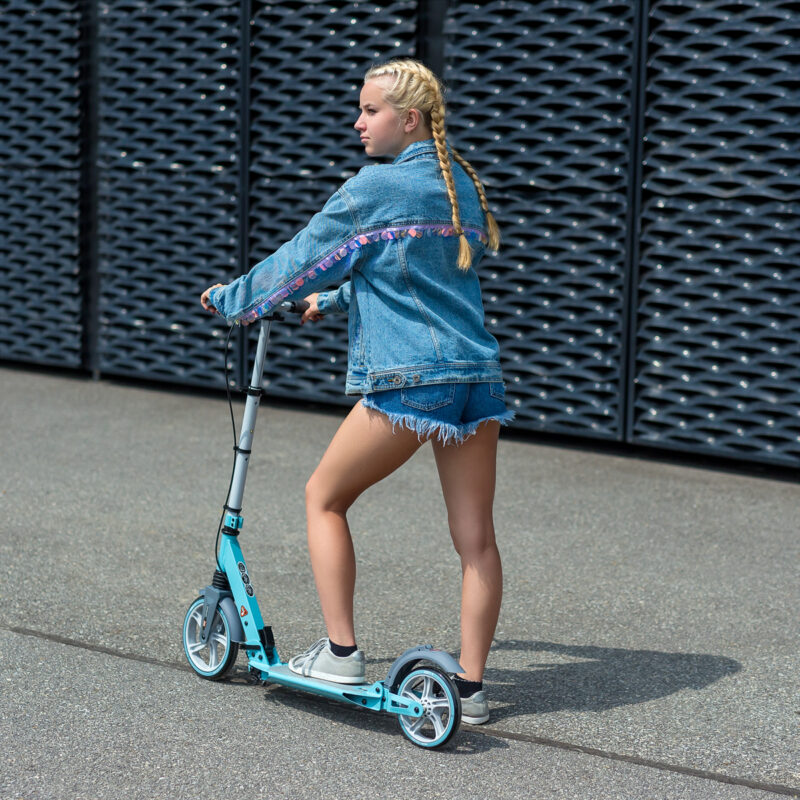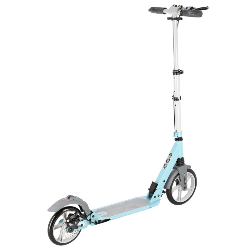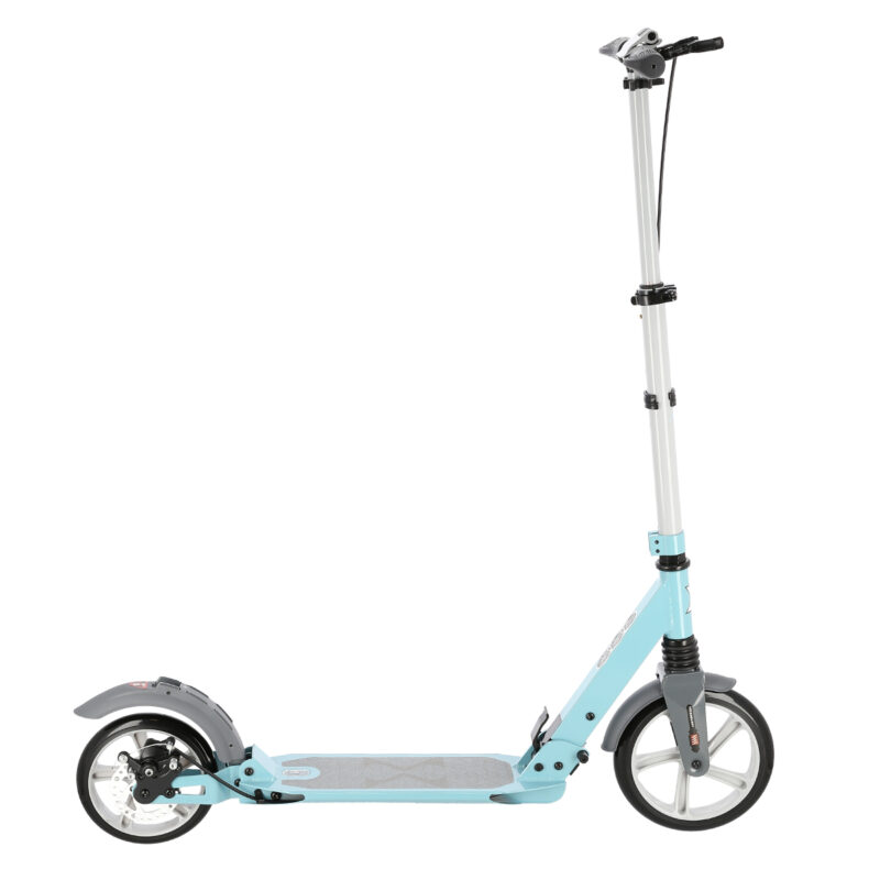 Der Lenker wurde mit Gummi-Griffen ausgestattet, die das sichere Greifen gewährleisten und keine Schürfwunden verursachen. Solche Lösung sorgt für Ihre stundenlange Freude beim Fahren. Die Verstellung des Lenkers ermöglicht es Ihnen, die Höhe des Lenkers an Ihre Körpergröße anzupassen. Der Roller HM229 hat zwei große Räder. Die Größe des Vorderrads beträgt 230 mm. Dies ermöglicht ein effizientes Steuern des Rollers und ein leichteres Überwinden von Unebenheiten. Die Lager der Klasse ABEC9 verbessern die Stabilität und garantieren eine reibungslose Fahrt.