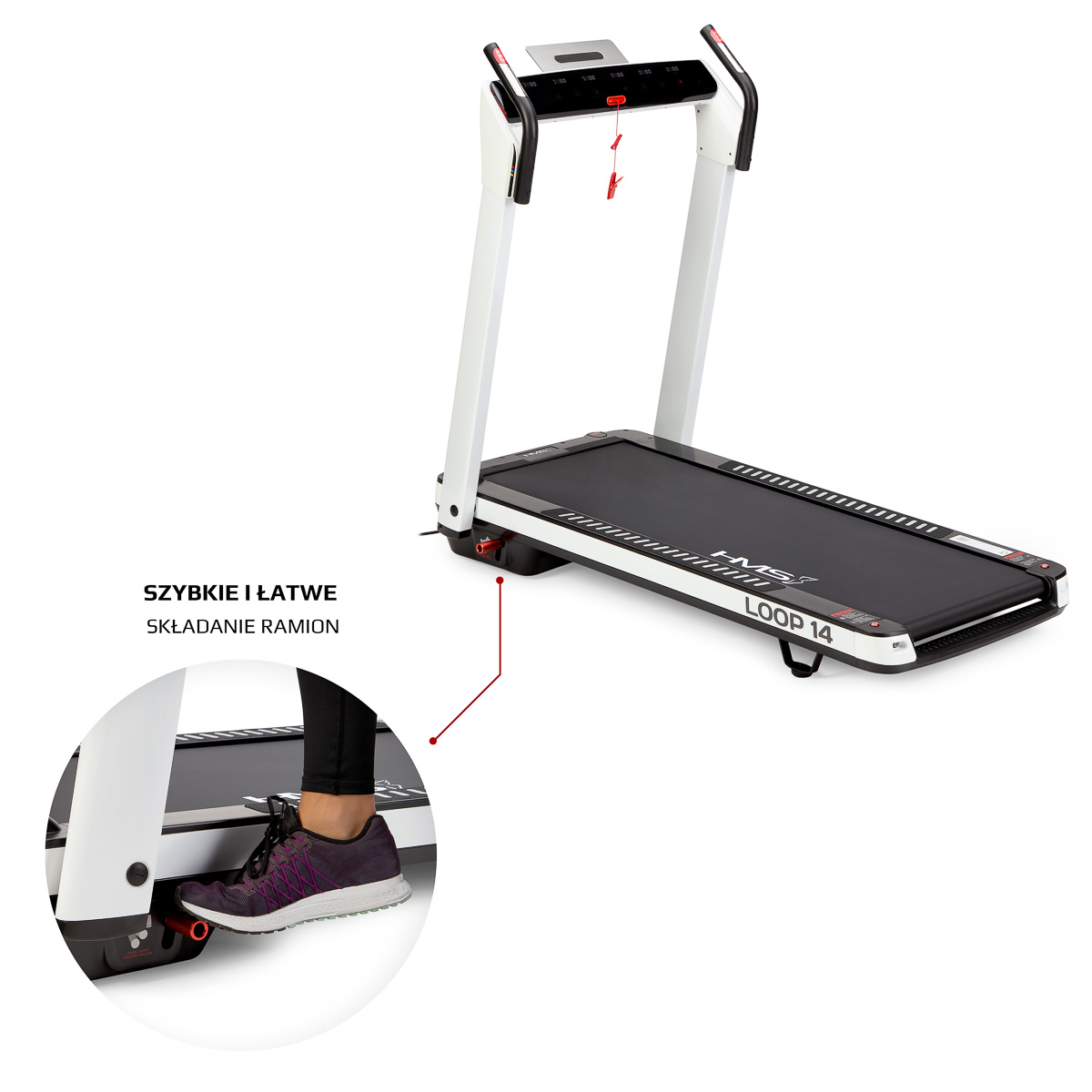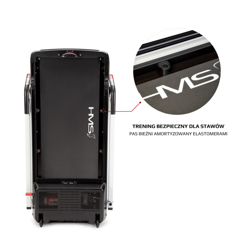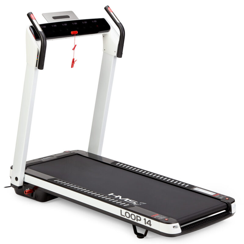 Das Laufband ist mit einer 12-stufigen Neigungsfunktion des Laufbandgurts ausgestattet. LOOP14 HMS verfügt über eine automatische Verstellung des Neigungswinkels des Laufbandgurts sowie eine Verstellung der Geschwindigkeit. Das Gerät ist zudem mit zusätzlichen Handpulssensoren zur Pulsmessung ausgestattet.
