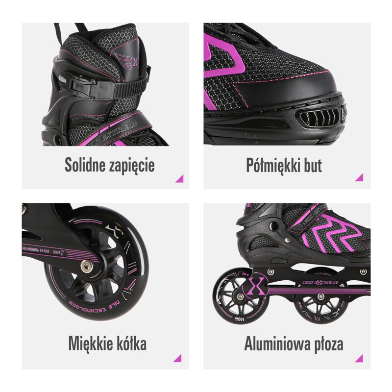 Ihre Konstruktion besteht aus dem leichten und ventilierten Schuh sowie aus der speziellen einteiligen und zusätzlich verstärkten Schiene aus Aluminium. Die hohe Qualität des Drehverlaufs gewährleisten die Lager der Klasse ABEC 9. Die weichen Rollen sorgen für die Bodenhaftung und absorbieren alle Vibrationen.