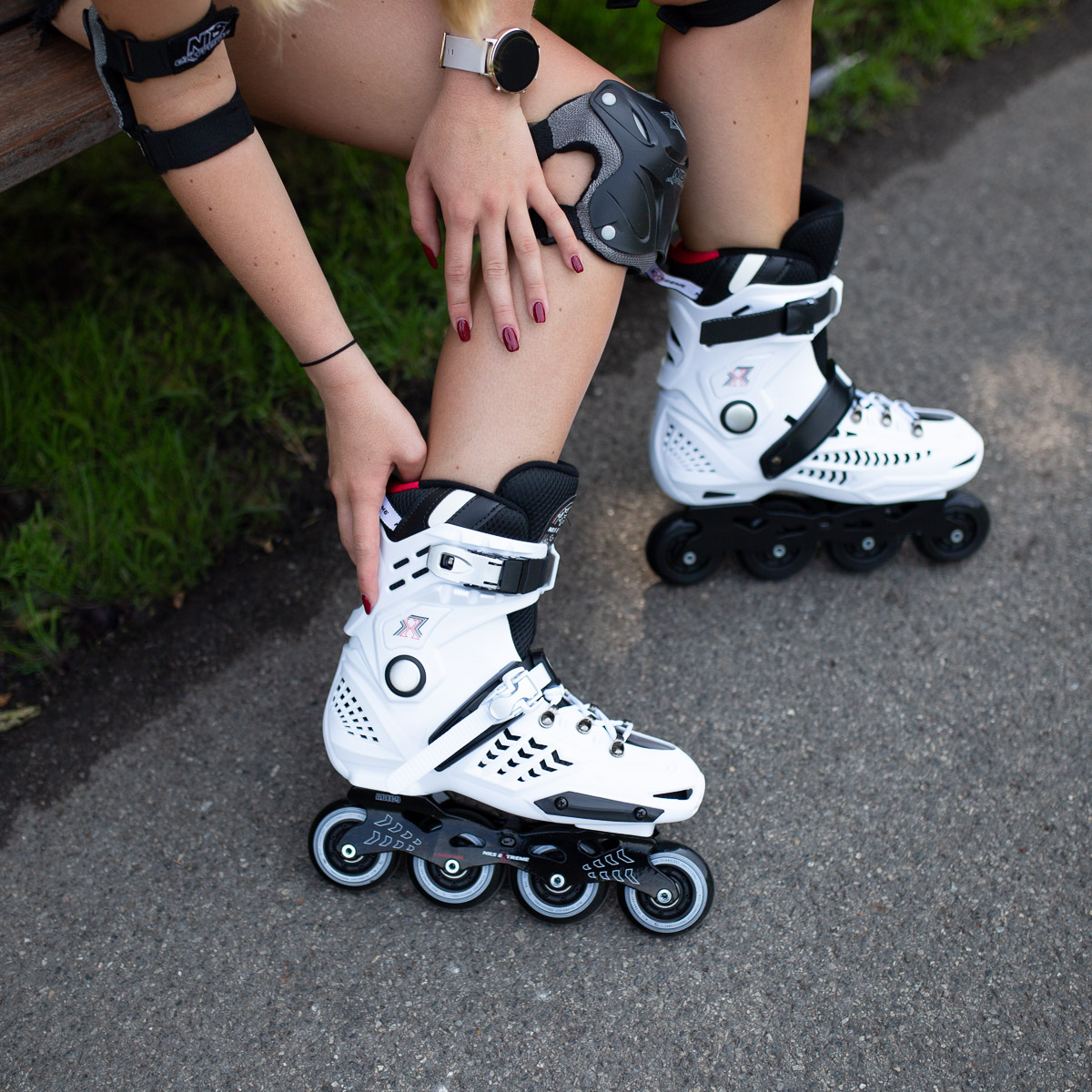Ihre Konstruktion besteht aus dem leichten Schuh sowie aus der speziellen einteiligen und zusätzlich verstärkten Schiene aus Aluminium. Die Schiene wurde bei der Nutzung der speziellen Technologie, sog. Druckguss, hergestellt. Die hohe Qualität des Drehverlaufs gewährleisten die Lager der Klasse ABEC 9. Die weichen Rollen sorgen für die Bodenhaftung und absorbieren alle Vibrationen. Ihre spezifische Konfiguration bildet einen Faktor der besseren Wendigkeit. Zwei mittlere Rollen sind größer als die äußersten, was bessere Kontrolle über den Fahrweg gewährleistet. Das Verschlusssystem besteht aus der zweiteiligen Verschlussschnalle aus Aluminium mit dem Spannmechanismus und aus der Schnürung. Dadurch können Sie die Schuhe an die gewünschte Größe anpassen. Auf der Außenseite des Schuhs befindet sich Slider als Element, das häufig bei Freeride-Fahrten benutzt wird.