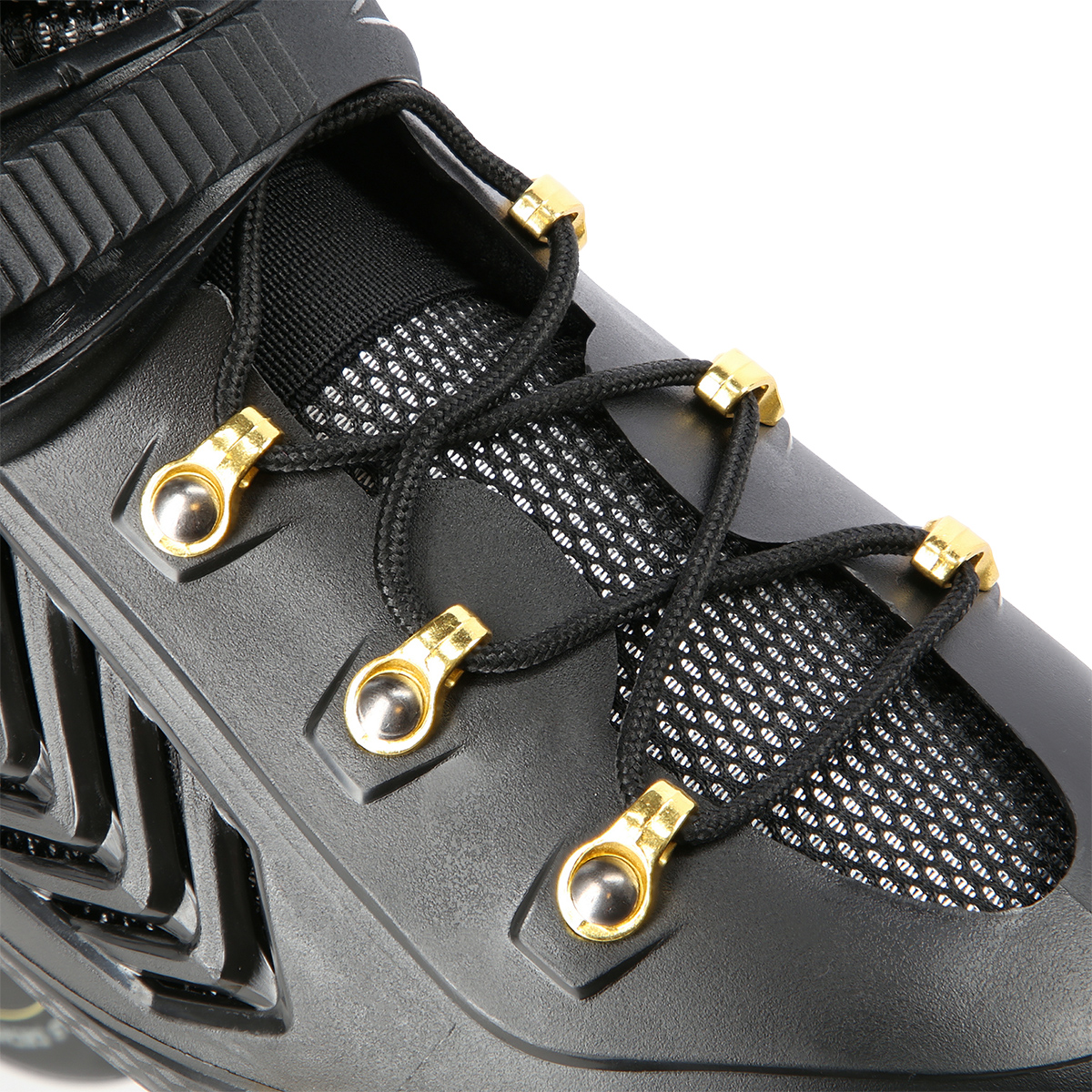 Ihre Konstruktion besteht aus dem leichten Schuh sowie aus der speziellen einteiligen und zusätzlich verstärkten Schiene aus Aluminium. Die Schiene wurde bei der Nutzung der speziellen Technologie, sog. Druckguss, hergestellt. Die hohe Qualität des Drehverlaufs gewährleisten die Lager der Klasse ABEC 9. Die weichen Rollen sorgen für die Bodenhaftung und absorbieren alle Vibrationen. Ihre spezifische Konfiguration bildet einen Faktor der besseren Wendigkeit. Zwei mittlere Rollen sind größer als die äußersten, was bessere Kontrolle über den Fahrweg gewährleistet. Das Verschlusssystem besteht aus der zweiteiligen Verschlussschnalle aus Aluminium mit dem Spannmechanismus und aus der Schnürung. Dadurch können Sie die Schuhe an die gewünschte Größe anpassen. Auf der Außenseite des Schuhs befindet sich Slider als Element, das häufig bei Freeride-Fahrten benutzt wird.