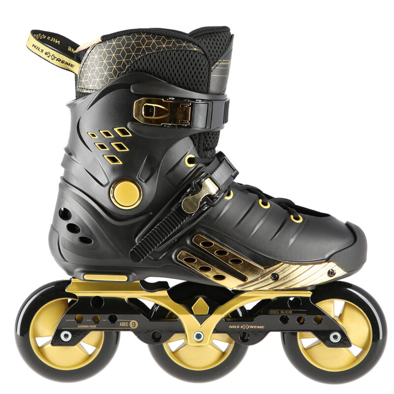 Die Inliner NA20006 Nils Extreme sind für Personen mit Vorkenntnissen und Fortgeschrittene konzipiert worden. Sie eignen sich zu Freizeitfahrten und zu Ausdauertrainings. Sie haben auch ein attraktives Design. Dies besteht nicht nur in ihrer interessanten Musterart, sondern auch in der Wahl der sehr hochwertigen Stoffe, aus denen diese Inliner hergestellt wurden. Der leichte und harte Schuh gewährleistet Ihnen die Sicherheit während der Fahrt. Die Inliner wurden mit Air-Vent-System der Schuhe ausgestattet und haben weiche Einlagen aus EVA-Material. Dies hat den direkten Einfluss auf den Tragekomfort des Benutzers. Die Inliner haben drei Rollen mit dem Durchmesser von 100 mm, die es Ihnen ermöglichen, hohe Geschwindigkeiten zu erreichen. Bei diesem Modell lassen sich auch insgesamt 4 Rollen mit dem Durchmesser von 90 mm montieren. Die Lager der Klasse ABEC 9 sorgen hingegen für hohe Qualität des Drehverlaufs. Dieses Modell verfügt auch über zwei Verschlussschnallen aus Aluminium, die in Verbindung mit der ganzen Konstruktion eine ideale Stabilisierung des Fußes gewährleisten.