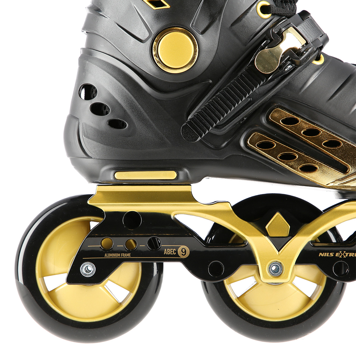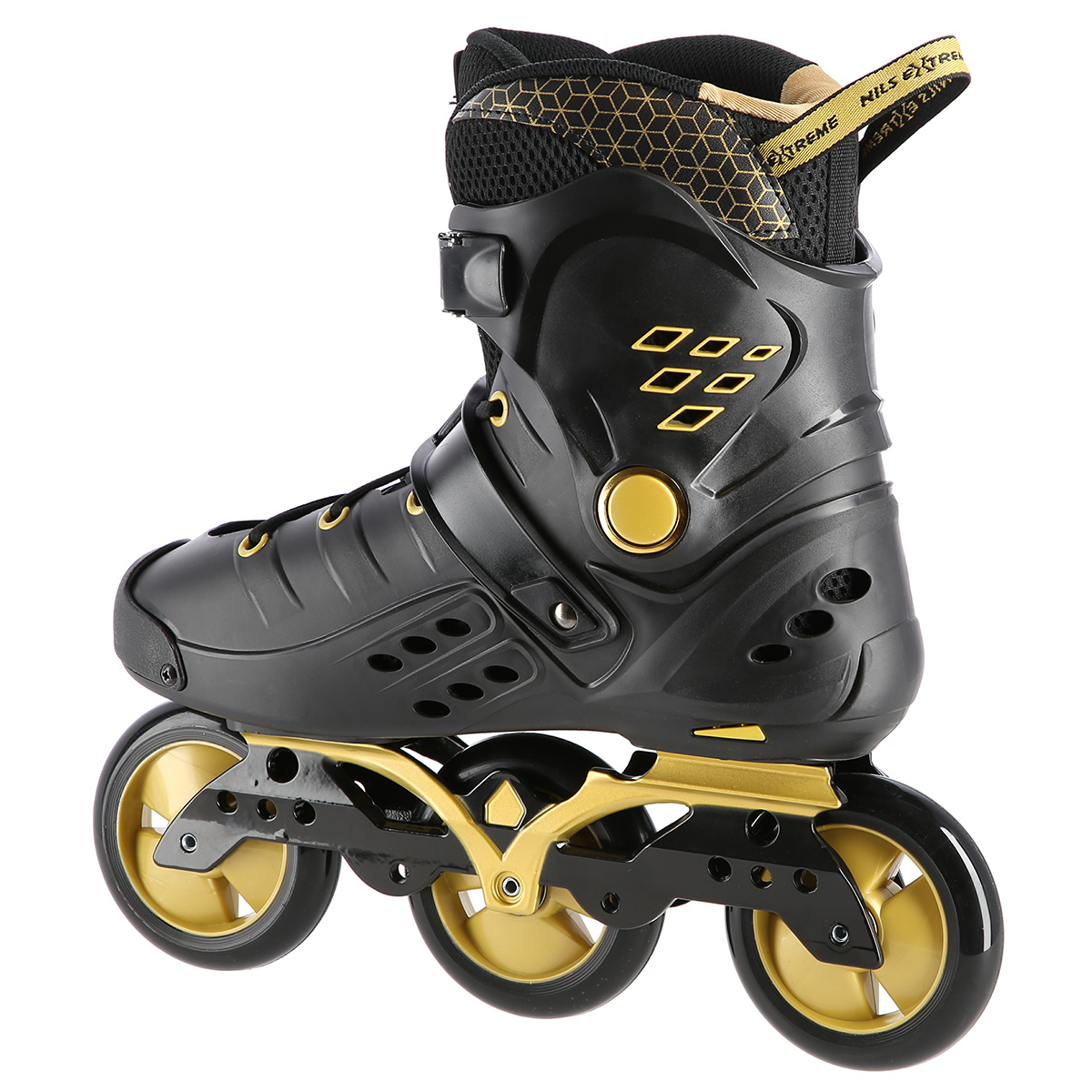 Die Inliner NA20006 Nils Extreme sind für Personen mit Vorkenntnissen und Fortgeschrittene konzipiert worden. Sie eignen sich zu Freizeitfahrten und zu Ausdauertrainings. Sie haben auch ein attraktives Design. Dies besteht nicht nur in ihrer interessanten Musterart, sondern auch in der Wahl der sehr hochwertigen Stoffe, aus denen diese Inliner hergestellt wurden. Der leichte und harte Schuh gewährleistet Ihnen die Sicherheit während der Fahrt. Die Inliner wurden mit Air-Vent-System der Schuhe ausgestattet und haben weiche Einlagen aus EVA-Material. Dies hat den direkten Einfluss auf den Tragekomfort des Benutzers. Die Inliner haben drei Rollen mit dem Durchmesser von 100 mm, die es Ihnen ermöglichen, hohe Geschwindigkeiten zu erreichen. Bei diesem Modell lassen sich auch insgesamt 4 Rollen mit dem Durchmesser von 90 mm montieren. Die Lager der Klasse ABEC 9 sorgen hingegen für hohe Qualität des Drehverlaufs. Dieses Modell verfügt auch über zwei Verschlussschnallen aus Aluminium, die in Verbindung mit der ganzen Konstruktion eine ideale Stabilisierung des Fußes gewährleisten.