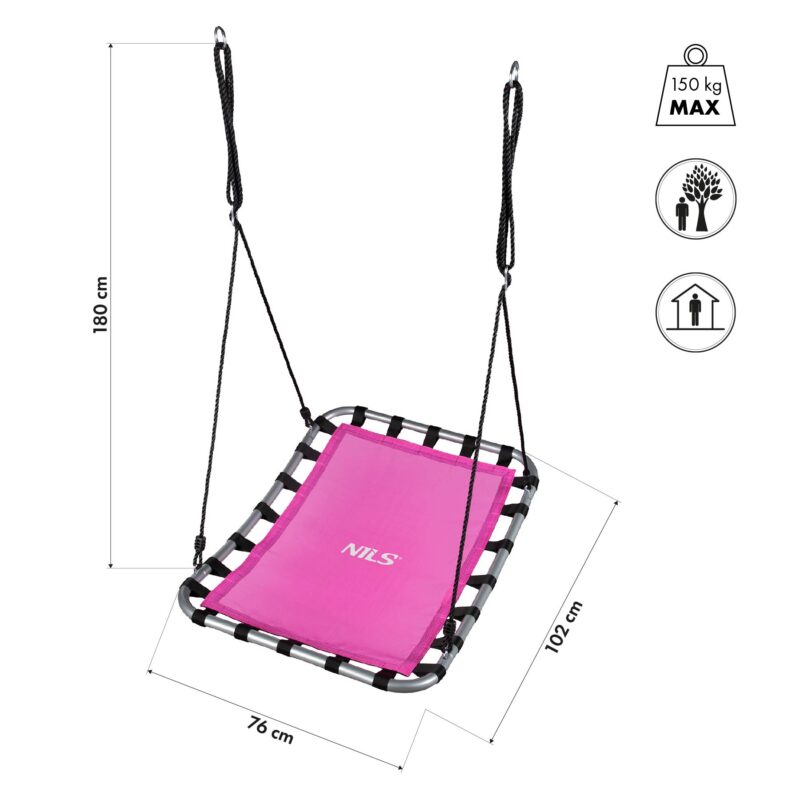 Ideal eignet es sich zum Aufhängen im Garten, auf der Terrasse oder auf dem Balkon. Bei schlechtem Wetter kann es auch im Haus aufgehängt werden. Die Montage ist sehr einfach. In wenigen Augenblicken werden Sie spielbereit. Die Nestschaukel hat eine runde Sitzfläche mit einem Durchmesser von bis zu 90 cm, die mehr Platz als nur für einen Liebhaber des Schaukelns bietet. Das ist zweifellos ein Vorteil, weil wir alle wissen, dass das Spiel in der Gesellschaft mehr Spaß macht. Mit der Möglichkeit, die Länge der Aufhängeseile zu verstellen, können Sie die Höhe an die Körpergröße eines Benutzers anpassen. In Verbindung mit der maximalen Belastung von 150 kg richtet sich dieses Produkt sowohl an kleine als auch an große Kinder. Für Kinder ist das großer Spaß und Spielerei, für Eltern bedeutet das Entspannung.