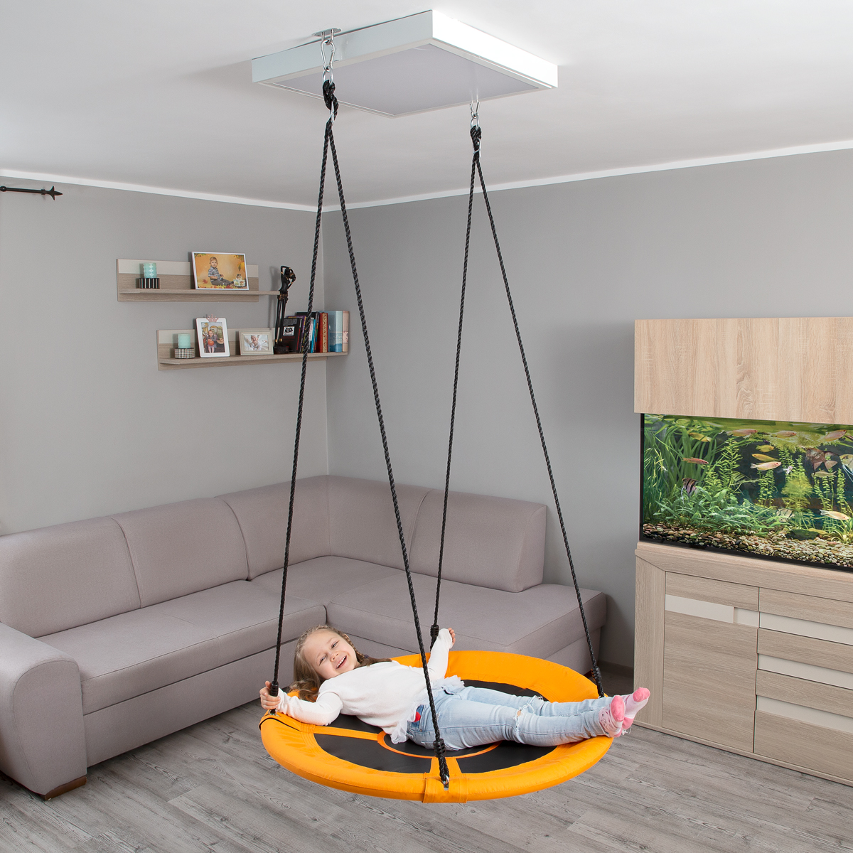 Ideal eignet es sich zum Aufhängen im Garten, auf der Terrasse oder auf dem Balkon. Bei schlechtem Wetter kann es auch im Haus aufgehängt werden. Die Montage ist sehr einfach. In wenigen Augenblicken werden Sie spielbereit. Die Nestschaukel hat eine runde Sitzfläche mit einem Durchmesser von bis zu 100 cm, die mehr Platz als nur für einen Liebhaber des Schaukelns bietet. Das ist zweifellos ein Vorteil, weil wir alle wissen, dass das Spiel in der Gesellschaft mehr Spaß macht. Mit der Möglichkeit, die Länge der Aufhängeseile zu verstellen, können Sie die Höhe an die Körpergröße eines Benutzers anpassen. In Verbindung mit der maximalen Belastung von 150 kg richtet sich dieses Produkt sowohl an kleine als auch an große Kinder. Für Kinder ist das großer Spaß und Spielerei, für Eltern bedeutet das Entspannung.