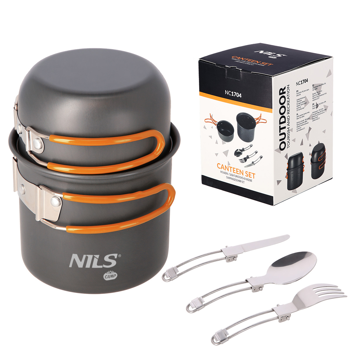 NC1704 ist ein Set aus Geschirr, bestehend aus einem Topf, einem Deckel, der auch die Funktion einer kleinen Pfanne erfüllt, und klappbaren Besteckteilen. Mit diesem Set können Sie schnell und lecker im Freien kochen.