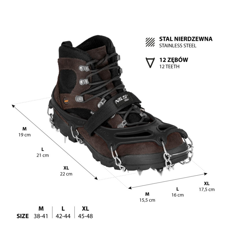 Die Unterseite der NC1717 ist mit 12 Edelstahlzähnen ausgestattet, jeweils 16 mm hoch, sowie einer 2 mm dicken Kette. Der obere Teil der NC1717 besteht aus robustem und dehnbarem Gummi, so dass der Benutzer die Spikes einfach an Wander- oder Trekkingstiefel anpassen kann.