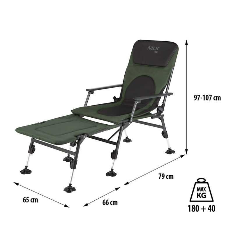 Die zusätzliche Liegefläche für den Angelstuhl NILS CAMP NC1802 ist ein echter Gamechanger, der den traditionellen Stuhl in eine echte Liege verwandelt. Dadurch kann man sich vollständig ausstrecken und die Entspannung in liegender Position genießen. Darüber hinaus ermöglicht der Verstellmechanismus der Rückenlehne den Übergang von der Sitz- zur Liegeposition, was dem Benutzer unbegrenzte Einstellungsmöglichkeiten vom 0 bis zu einem bequemen Winkel bietet, angepasst an individuelle Vorlieben.