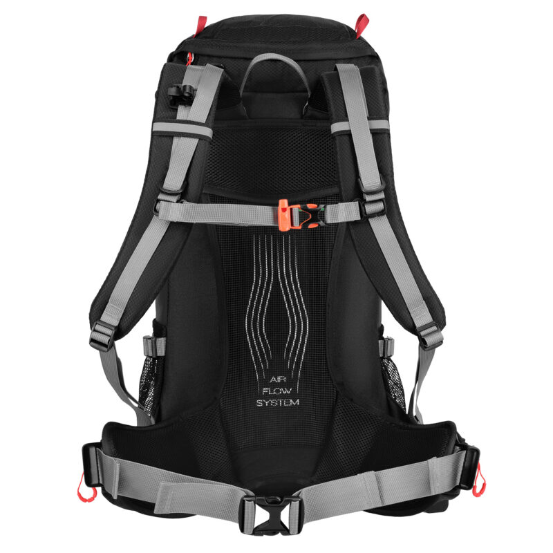 Eine integrierte Rettungspfeife an der Brustgurtschnalle sorgt für zusätzliche Sicherheit. Ein zusätzliches Griffpanel ermöglicht die Befestigung von z. B. Trekkingstöcken oder anderem Zubehör. Der Rucksack verfügt außerdem über zwei seitliche Netztaschen und eine Reißverschlusstasche am Hüftgurt, ideal für ein Telefon oder andere kleine Gegenstände.