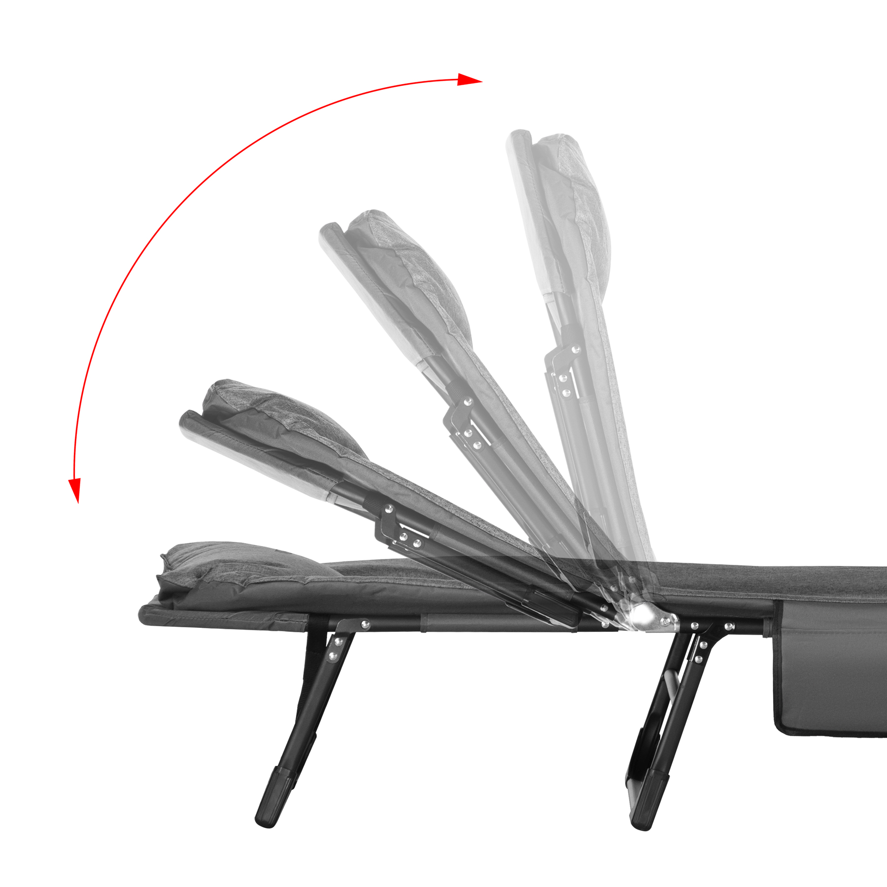 Die verstellbare Rückenlehne ermöglicht verschiedene Liegepositionen – von ganz flach bis halbsitzend – perfekt zum Entspannen mit einem Buch oder zum Fernsehen. Wenn das Bett nicht gebraucht wird, kann es platzsparend im Schrank, unter dem Bett oder in einem Abstellraum verstaut werden.