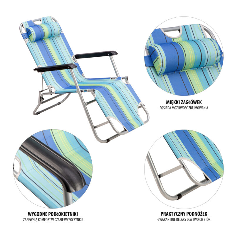 Es ist ein idealer Begleiter nicht nur am Strand, sondern auch im Garten oder auf dem Campingplatz. Das ist ein universeller Liegestuhl, der sich unter allen Bedingungen und überall benutzen lässt. NC3024 ist klappbar, daher kann man ihn problemlos überall mitnehmen. Der Liegestuhl lässt sich in zwei Positionen aufstellen. Sie können sich sowohl auf dem Rücken als auch auf dem Bauch sonnen. Das ist ein attraktives Produkt, insbesondere für diejenigen, die nicht gern z. B. im Sand liegen. In der Sitzposition kann sich der Benutzer auch auf dem Liegestuhl sonnen. Er findet auch die Verwendung bei einem Campingtisch. Um Ihnen den besseren Komfort zu gewährleistet, ist er mit einem Kissen ausgestattet. Man kann es beliebig einstellen und an seine Bedürfnisse anpassen.