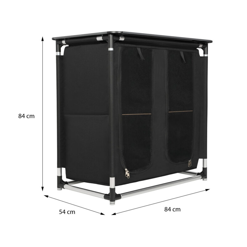 Der Schrank NC3032 ist mit zwei geräumigen Regalböden ausgestattet, die eine bequeme Aufbewahrung von Lebensmitteln, Geschirr, Kleidung oder Reiseutensilien ermöglichen. Die verschließbare Konstruktion schützt den Inhalt wirksam vor Staub, Wind und Insekten.