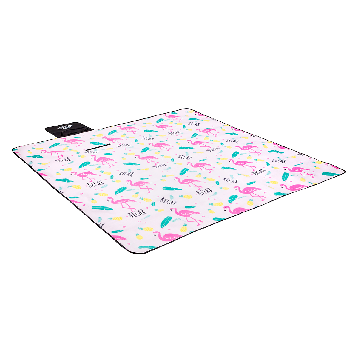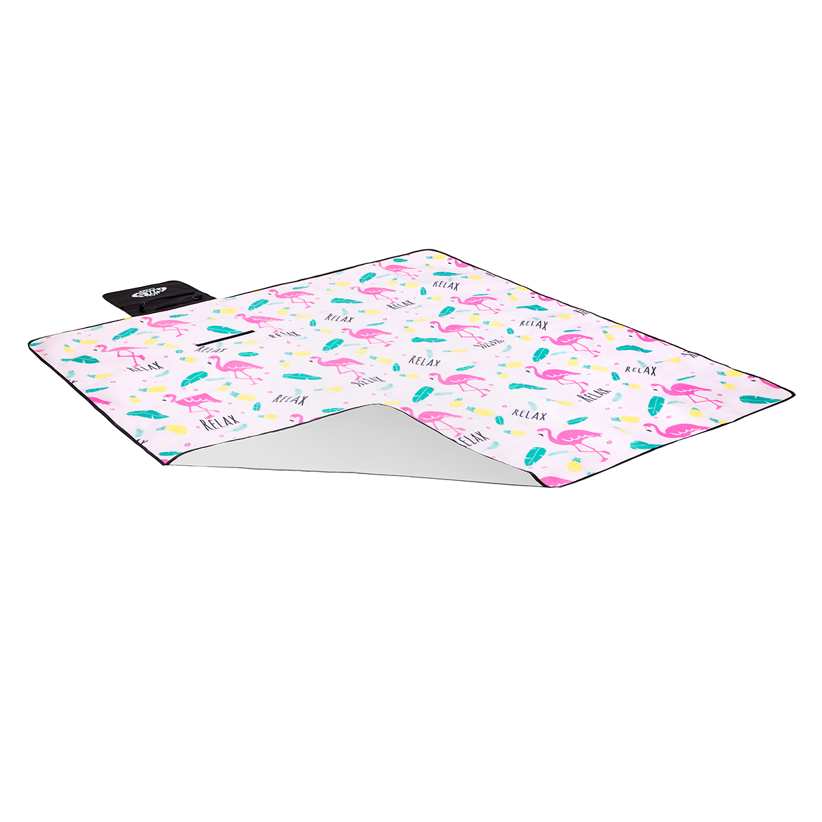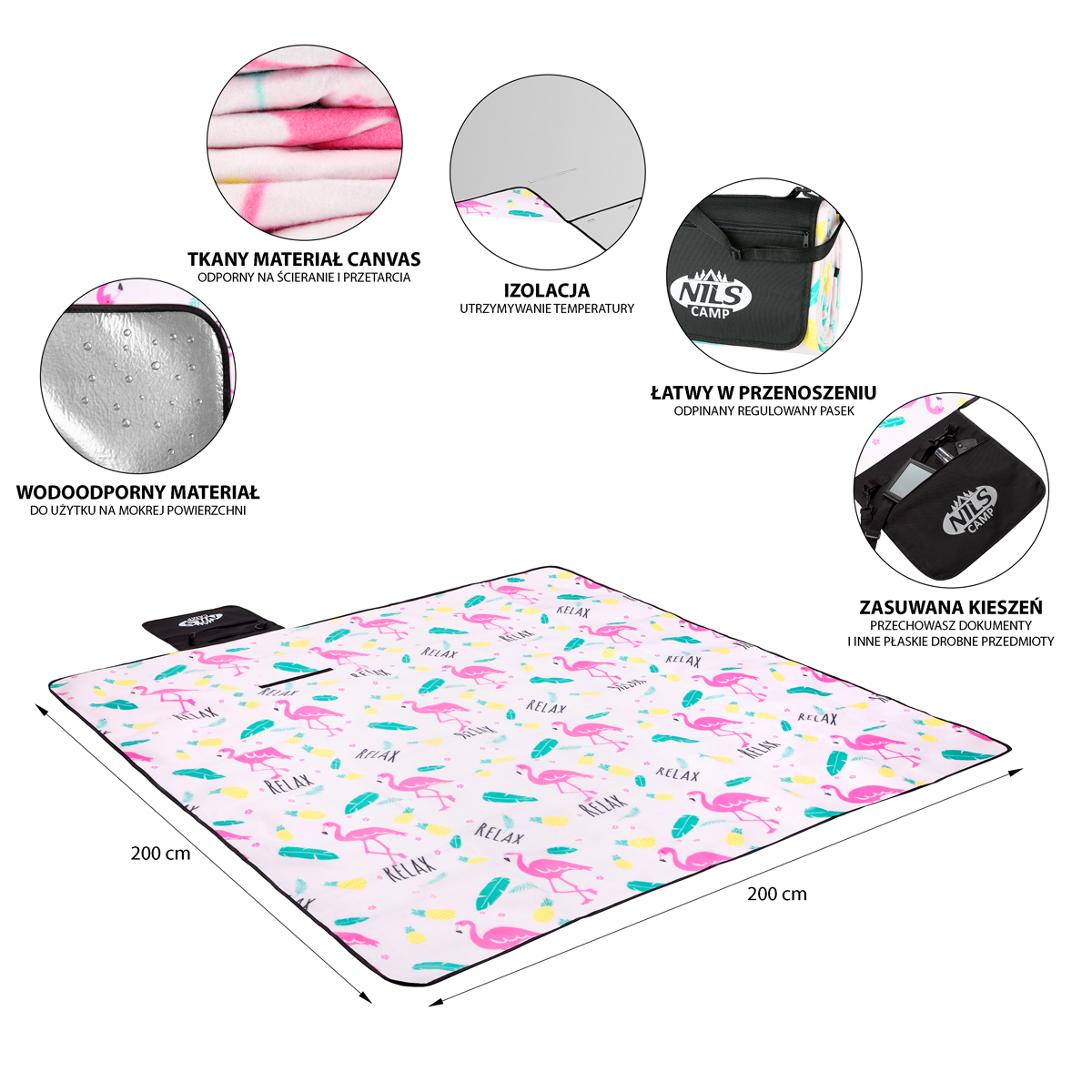 Es geht um eine Picknickdecke mit einer großen Oberfläche (200×200), die für eine große Familie geeignet ist. Eine solche Lösung ist viel effizienter als zwei kleinere Decken. Es besteht kein Risiko, dass die Decken sich ausbreiten und eines Ihrer Dinge auf das Gras oder schlimmer noch, auf den Sand fällt. Ihr zweifelloser Vorteil, der sofort ins Auge fällt, ist ihr Design. Tolle Farben und die Grafik in sehr modischen Flamingos machen die Decke nicht nur bequem und funktionell, sondern auch angenehm für das Auge.