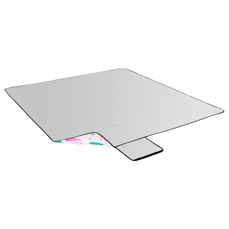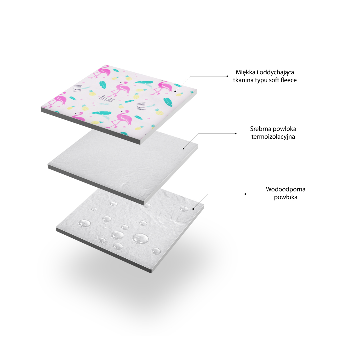 Die Decke besteht aus zwei Materialschichten. Die obere Schicht besteht aus hochwertigem Vlies, das sich durch die Weichheit und den Schutz vor dem kalten Boden auszeichnet. Dies verbessert selbstverständlich den Benutzungskomfort. Auf dem unteren Teil befindet sich hingegen eine Schicht aus Aluminium, die wasserdicht ist und es ermöglicht, die Decke z.B. auf feuchtem Sand oder auf dem mit Tau bedeckten Gras zu verwenden. Diese beiden Stoffe bilden eine ausgezeichnete Wärmedämmschicht.