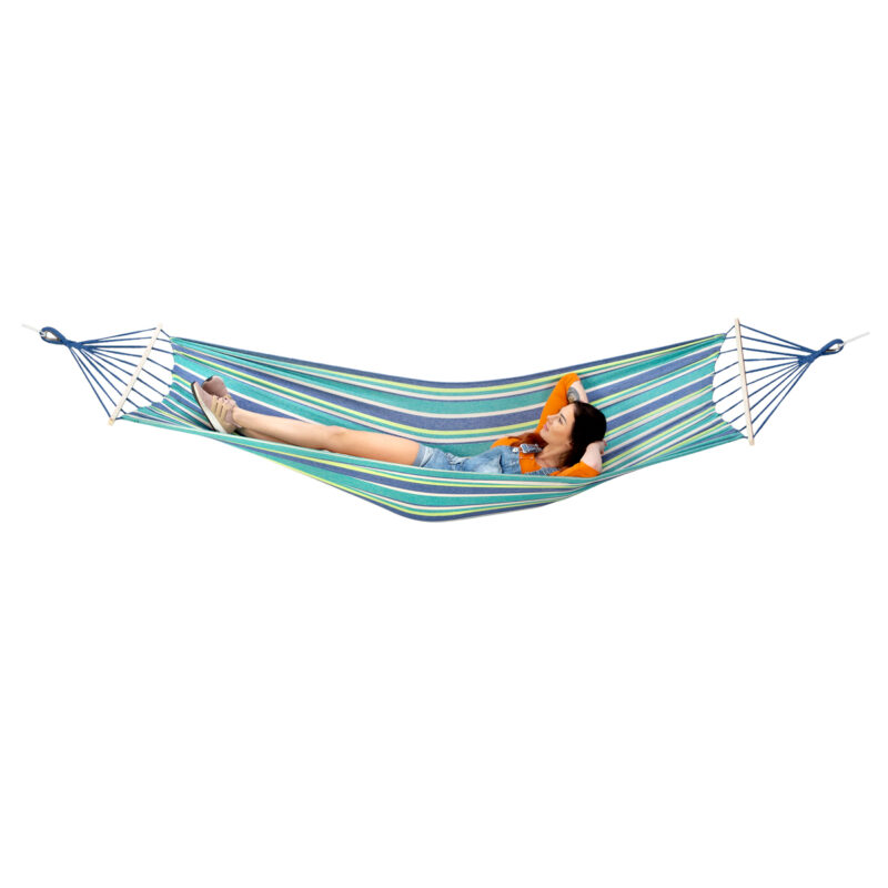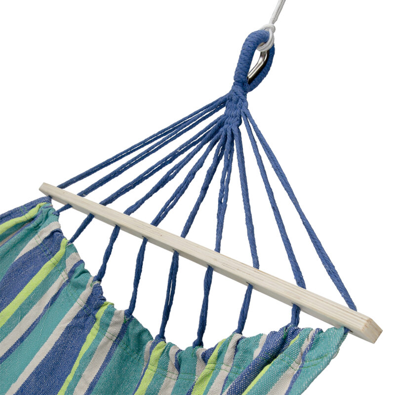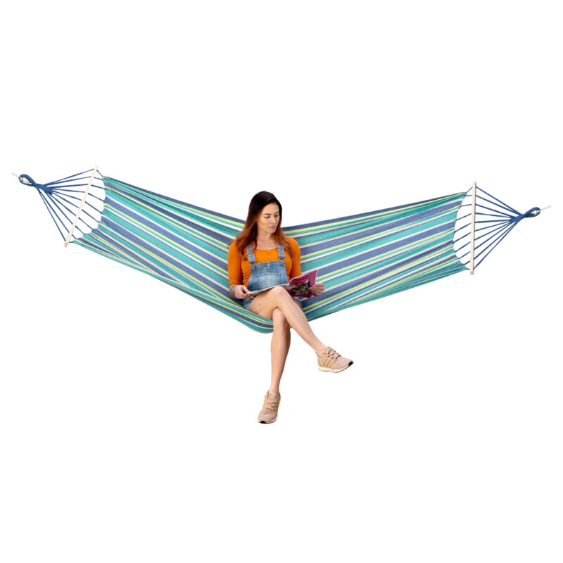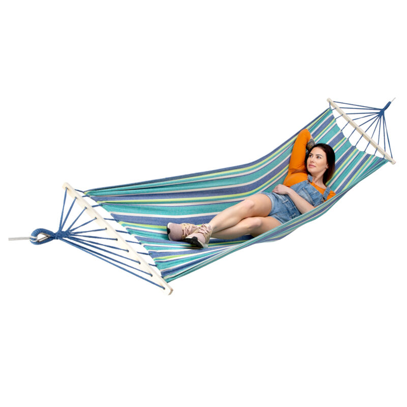 Das ist eine Hängematte, die sich zum Aufhängen z.B. zwischen zwei Bäumen eignet. Sie ist leicht aufzuhängen und alle Befestigungselemente finden Sie im Set. Nach wenigen Augenblicken werden Sie die glückselige Entspannung genießen können. Ein 70 cm langer Holzstab, der als Verstärkung in die Hängematte montiert wird, verhindert das Dehnen vom Material. Die Elastizität des Materials ist immer gleich hoch. Dadurch werden Sie sich wohlfühlen, und zwar für viele Saisons. Die Hängematte passt sich unserem Körper perfekt an, und die Breite von 100 cm gewährleistet, dass jeder eine bequeme Position findet. Der Stoff der Hängematte besteht aus Polyester und angenehmer, dicht gewebter Baumwolle. Mit dieser Kombination ist die Hängematte länger haltbar. Dadurch entsteht es auch keine Verformung.