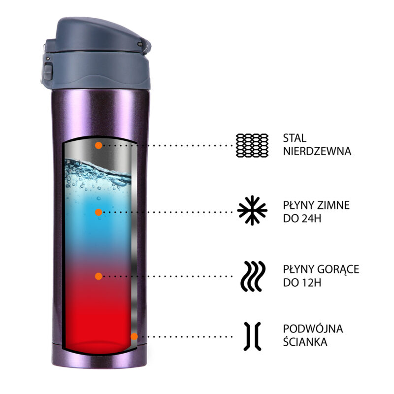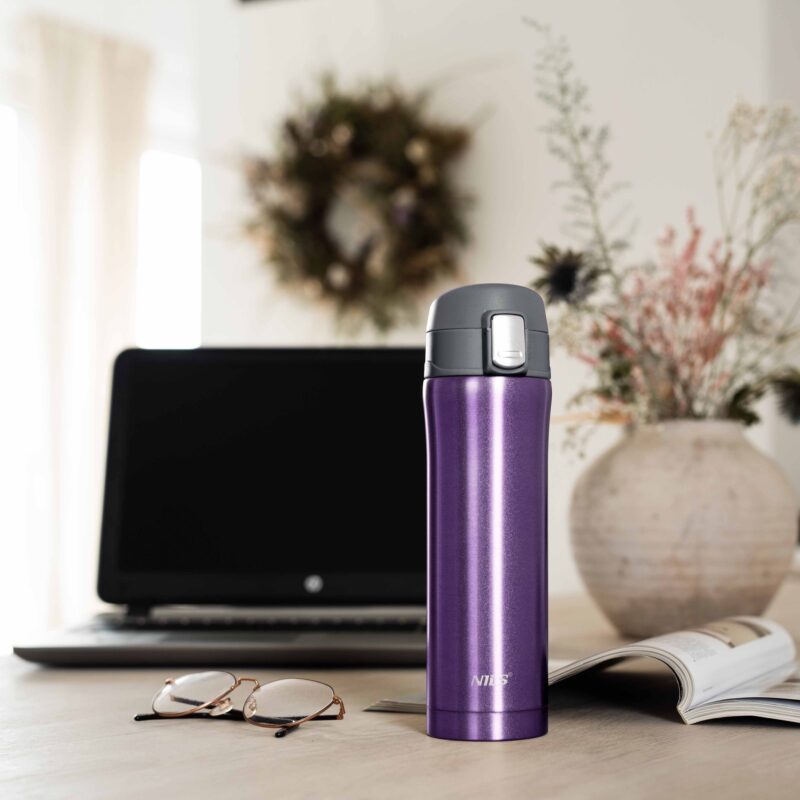 Der Thermobecher NCB10 der Marke NILS zeichnet sich sowohl durch eine einfache Konstruktion als auch durch sein originelles Design aus! NCB10 ist doppelwandig und aus rostfreiem Stahl hergestellt, daher hält er die eingefüllten Getränke warm bis zu 12 Stunden und kalt bis zu 24 Stunden. Die von anderen Modellen unterscheidende Eigenschaft ist ein Verriegelungs-System. Daher ist der Thermobecher sehr dicht. Man kann ihn mitnehmen und muss sich keine Sorgen darüber machen, dass er nicht auslaufsicher ist. Um die Verriegelung zu lösen und den Deckel zu öffnen, reicht es, den Druckknopf nach unten zu schieben und ihn dann zu drücken. Der Thermobecher öffnet sich automatisch!