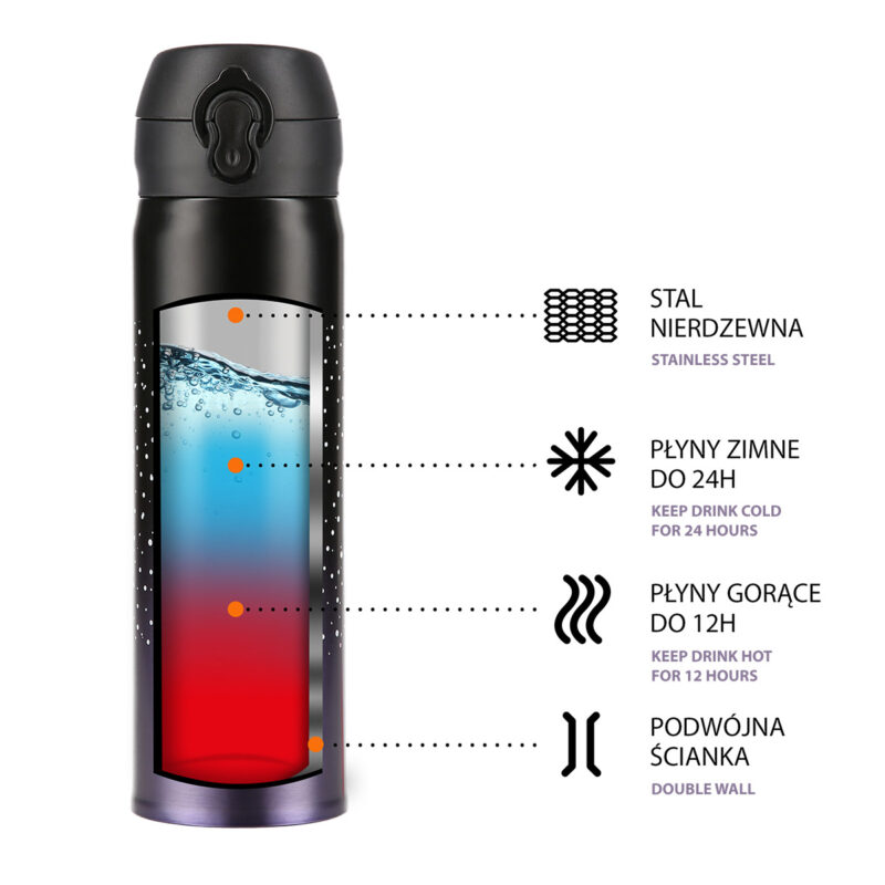 Der Thermobecher NCB11 der Marke NILS zeichnet sich sowohl durch eine einfache Konstruktion als auch durch sein originelles Design aus! NCB11 ist doppelwandig und aus rostfreiem Stahl hergestellt, daher hält er die eingefüllten Getränke warm bis zu 12 Stunden und kalt bis zu 24 Stunden. Die von anderen Modellen unterscheidende Eigenschaft ist ein Verriegelungs-System. Daher ist der Thermobecher sehr dicht. Man kann ihn mitnehmen und muss sich keine Sorgen darüber machen, dass er nicht auslaufsicher ist. Um die Verriegelung zu lösen und den Deckel zu öffnen, reicht es, den Druckknopf nach unten zu schieben und ihn dann zu drücken. Der Thermobecher öffnet sich automatisch!