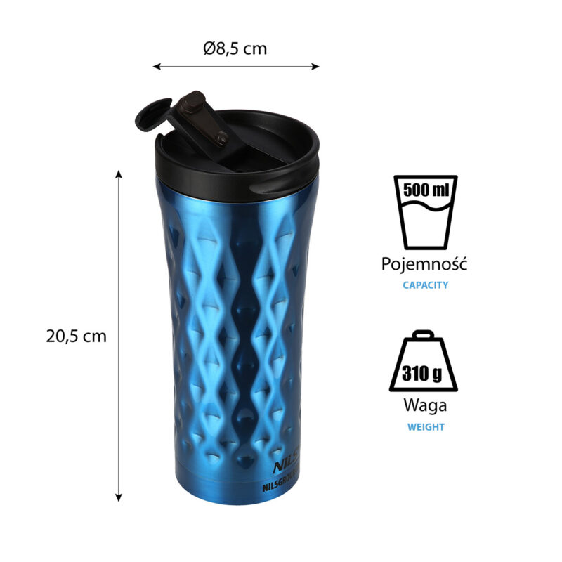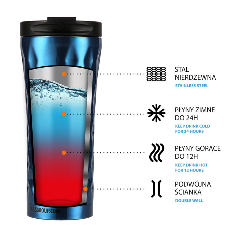 Der Thermobecher NCB44 der Marke NILS zeichnet sich sowohl durch eine einfache Konstruktion als auch durch sein originelles Design aus! NCB44 ist doppelwandig und aus rostfreiem Stahl hergestellt, daher hält er die eingefüllten Getränke warm bis zu 12 Stunden und kalt bis zu 24 Stunden. Der Thermobecher NCB44 hat ein sehr bequemes Öffnungssystem. Es reicht nur den Griff nach oben zu ziehen. Ein großer Vorteil ist auch die rutschfeste Unterseite des Bechers aus Gummi, was vor dem Verschütten des heißen Kaffes oder Tees schützt, wenn der Thermobecher geöffnet ist!