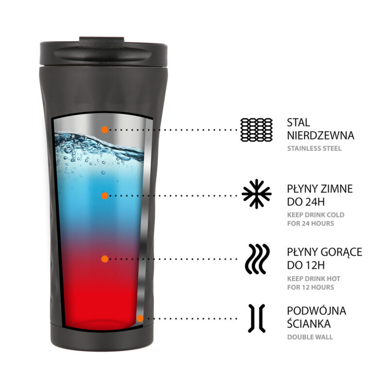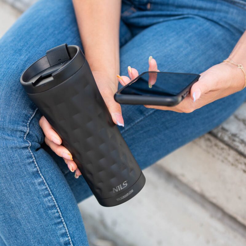 Der Thermobecher NCB44 der Marke NILS zeichnet sich sowohl durch eine einfache Konstruktion als auch durch sein originelles Design aus! NCB44 ist doppelwandig und aus rostfreiem Stahl hergestellt, daher hält er die eingefüllten Getränke warm bis zu 12 Stunden und kalt bis zu 24 Stunden. Der Thermobecher NCB44 hat ein sehr bequemes Öffnungssystem. Es reicht nur den Griff nach oben zu ziehen. Ein großer Vorteil ist auch die rutschfeste Unterseite des Bechers aus Gummi, was vor dem Verschütten des heißen Kaffes oder Tees schützt, wenn der Thermobecher geöffnet ist!