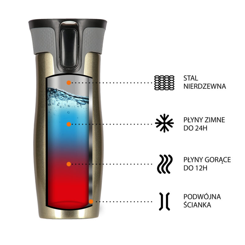 Der Thermobecher NCC03 der Marke NILS CAMP zeichnet sich sowohl durch eine einfache Konstruktion als auch durch sein originelles Design aus! NCC03 ist doppelwandig und aus rostfreiem Stahl hergestellt, daher hält er die eingefüllten Getränke warm bis zu 12 Stunden und kalt bis zu 24 Stunden. Der Thermobecher NCC03 hat ein sehr innovatives Öffnungssystem. Wenn man trinken möchte, soll man den Druckknopf drücken und gedrückt halten. Das Verringelungssystem wird geöffnet. Um den Thermobecher zu schließen, reicht es, den Durckknopf zu lösen. Ein großer Vorteil ist auch die rutschfeste Unterseite des Bechers aus Gummi, was vor dem Verschütten des heißen Kaffes oder Tees schützt, wenn der Thermobecher geöffnet ist!