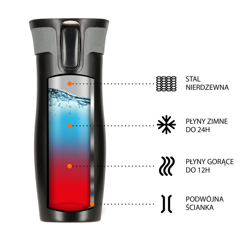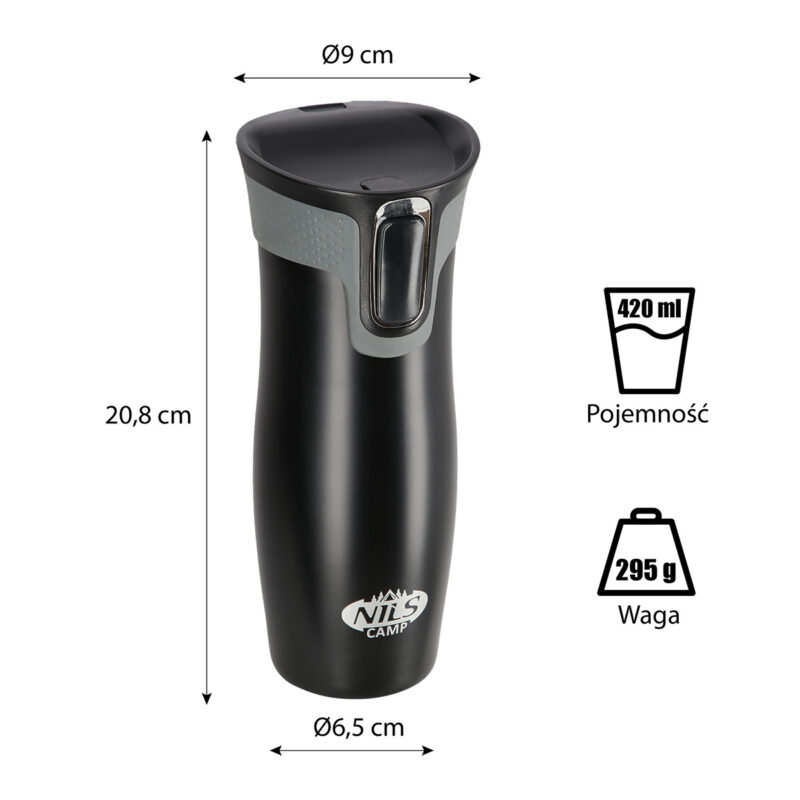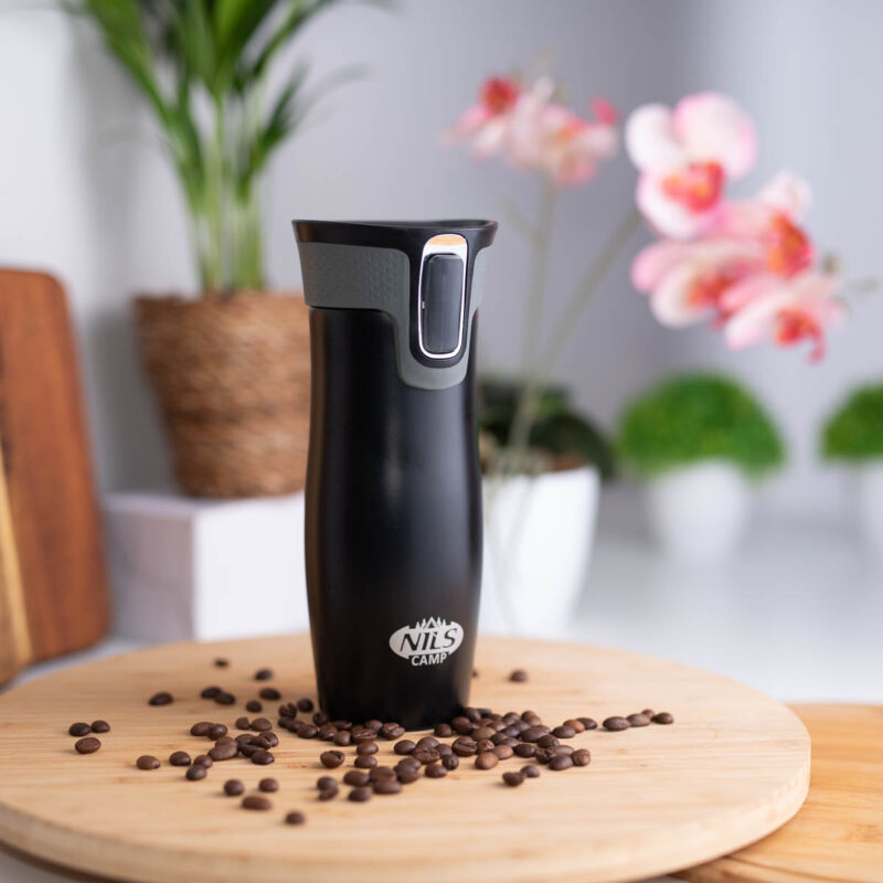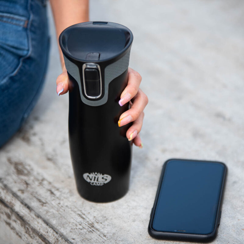 Der Thermobecher NCC03 der Marke NILS CAMP zeichnet sich sowohl durch eine einfache Konstruktion als auch durch sein originelles Design aus! NCC03 ist doppelwandig und aus rostfreiem Stahl hergestellt, daher hält er die eingefüllten Getränke warm bis zu 12 Stunden und kalt bis zu 24 Stunden. Der Thermobecher NCC03 hat ein sehr innovatives Öffnungssystem. Wenn man trinken möchte, soll man den Druckknopf drücken und gedrückt halten. Das Verringelungssystem wird geöffnet. Um den Thermobecher zu schließen, reicht es, den Durckknopf zu lösen. Ein großer Vorteil ist auch die rutschfeste Unterseite des Bechers aus Gummi, was vor dem Verschütten des heißen Kaffes oder Tees schützt, wenn der Thermobecher geöffnet ist!