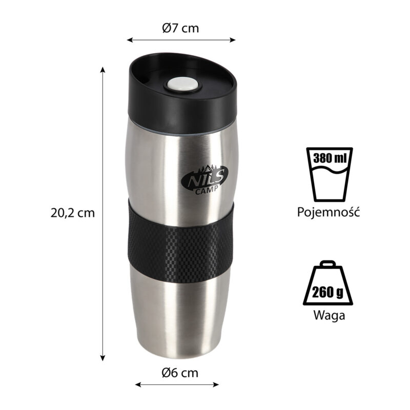 Der Thermobecher NCC05 der Marke NILS CAMP zeichnet sich sowohl durch eine einfache Konstruktion als auch durch sein originelles Design aus! NCC05 ist doppelwandig und aus rostfreiem Stahl hergestellt, daher hält er die eingefüllten Getränke warm bis zu 12 Stunden und kalt bis zu 24 Stunden. Der Thermobecher NCC05 hat ein sehr bequemes Öffnungssystem. Es reicht nur den Druckknopf zu drücken. Der Thermobecher NCC05 ist auch gummiert im Greiffteil, was das Halten des Produkts erleichtert und die Sicherheit beim Transport erhöht. Ein großer Vorteil ist auch die rutschfeste Unterseite des Bechers aus Gummi, was vor dem Verschütten des heißen Kaffes oder Tees schützt, wenn der Thermobecher geöffnet ist!