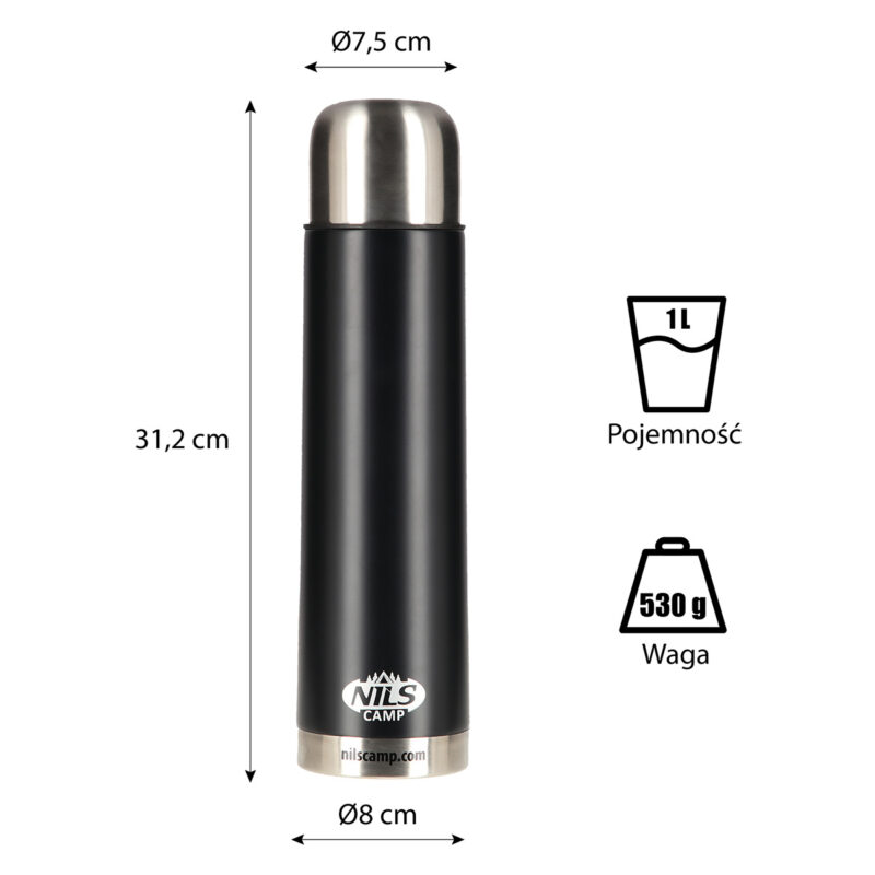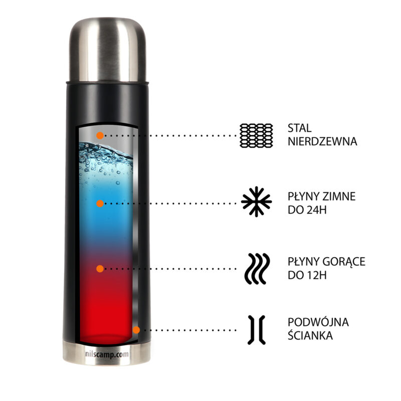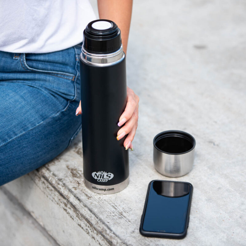 Die NCC07 Thermosflasche Nils Camp zeichnet sich durch eine einfache Konstruktion und ein stromlinienförmiges Design aus! NCC07 ist eine Thermosflasche aus rostfreiem Stahl mit doppelter Wand, daher hält sie die eingefüllten Getränke warm bis zu 12 Stunden und kalt bis zu 24 Stunden. Die NCC07 Thermosflasche hat ein sehr praktisches Öffnungssystem. Drücken Sie einfach den Druckknopf und fertig. Dank dem Deckel, der als Becher dient, ist die Thermosflasche bei der Arbeit, zu Hause und auf Reisen nützlich.