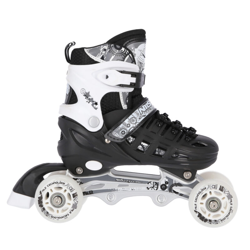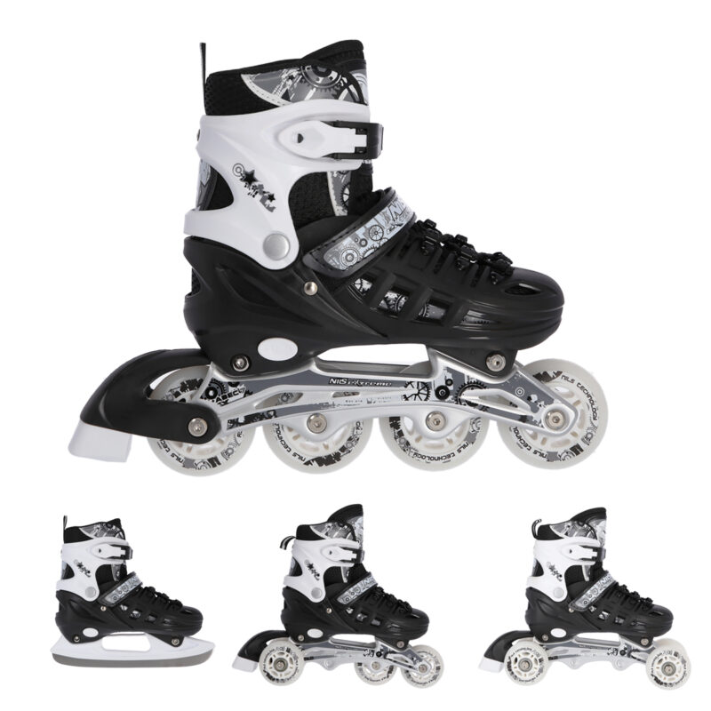 NH10905 Set Nils Extreme sind für Liebhaber von Inlineskating und Hockey bestimmt. Dieses Produkt bietet 4 Konfigurationsmöglichkeiten an, nämlich: Schlittschuhe, Inliner, Rollschuhe und Inliner-Rollschuhe.