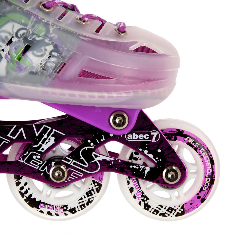 Das Produkt NH18122 steht für reine Freude. Dank der Möglichkeit der Änderung von Rollen auf die Hinterachse können sich die Inliner funktional in Inliner-Rollschuhe verwandeln. Diese Lösung ermöglicht es den Jüngsten, die ersten Schritte in diesem Sport zu tun. Wenn noch eine Rolle montiert wird, aber in diesem Falle auf die Vorderachse, kann sich das Produkt funktional in Rollschuhe verwandeln. Dieses Produkt ist mit einer Alu-Schiene und einer Bremse ausgestattet, was die Sicherheit gewährleistet. Die Rollen und die Lager der Klasse ABEC7 ermöglichen Ihnen einen geringeren Rollwiderstand, d.h. eine schnellere Fahrt.