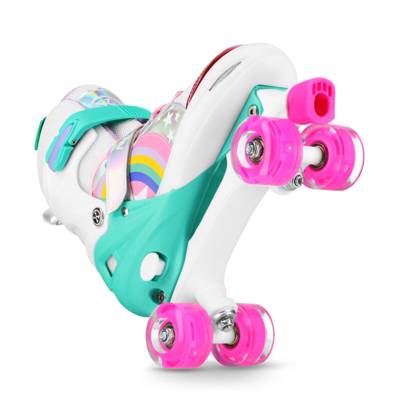 Die Rollschuhe sind mit ABEC-7-Kugellagern ausgestattet, die auch auf längeren Strecken für eine reibungslose und dynamische Fahrt sorgen. Die Räder aus hochwertigem PU wurden zusätzlich mit effektvollen LEDs versehen, die bei Bewegung leuchten, was nicht nur die Optik des Produkts aufwertet, sondern auch die Sichtbarkeit des Benutzers bei schlechten Lichtverhältnissen verbessert.