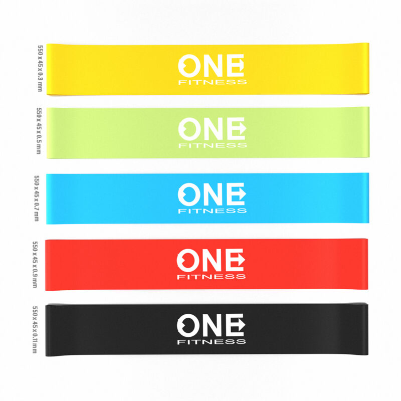 PBF SET05 One Fitness ist ein Set, das aus fünf Widerstandsbändern besteht. Sie können während verschiedener Arten von Übungen eingesetzt werden und finden Verwendung bei Kräftigungs-, Stabilisierungs-, Mobilisierungs- und Rehabilitationsübungen.