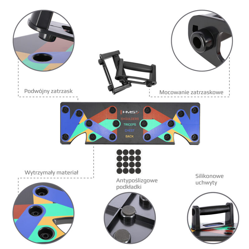 PU10 MULTI von der Marke HMS ist ein innovatives und multifunktionales Liegestützbrett, das zur Ausführung der Liegestütze dient, d. h. zur Beugung von beiden Armen beim Abstützen.