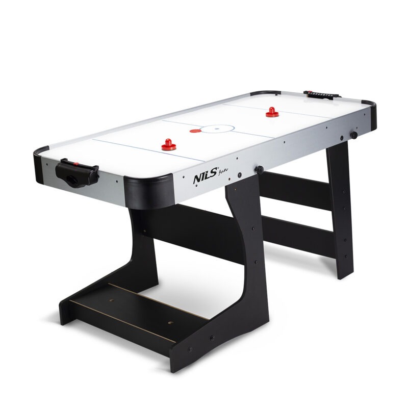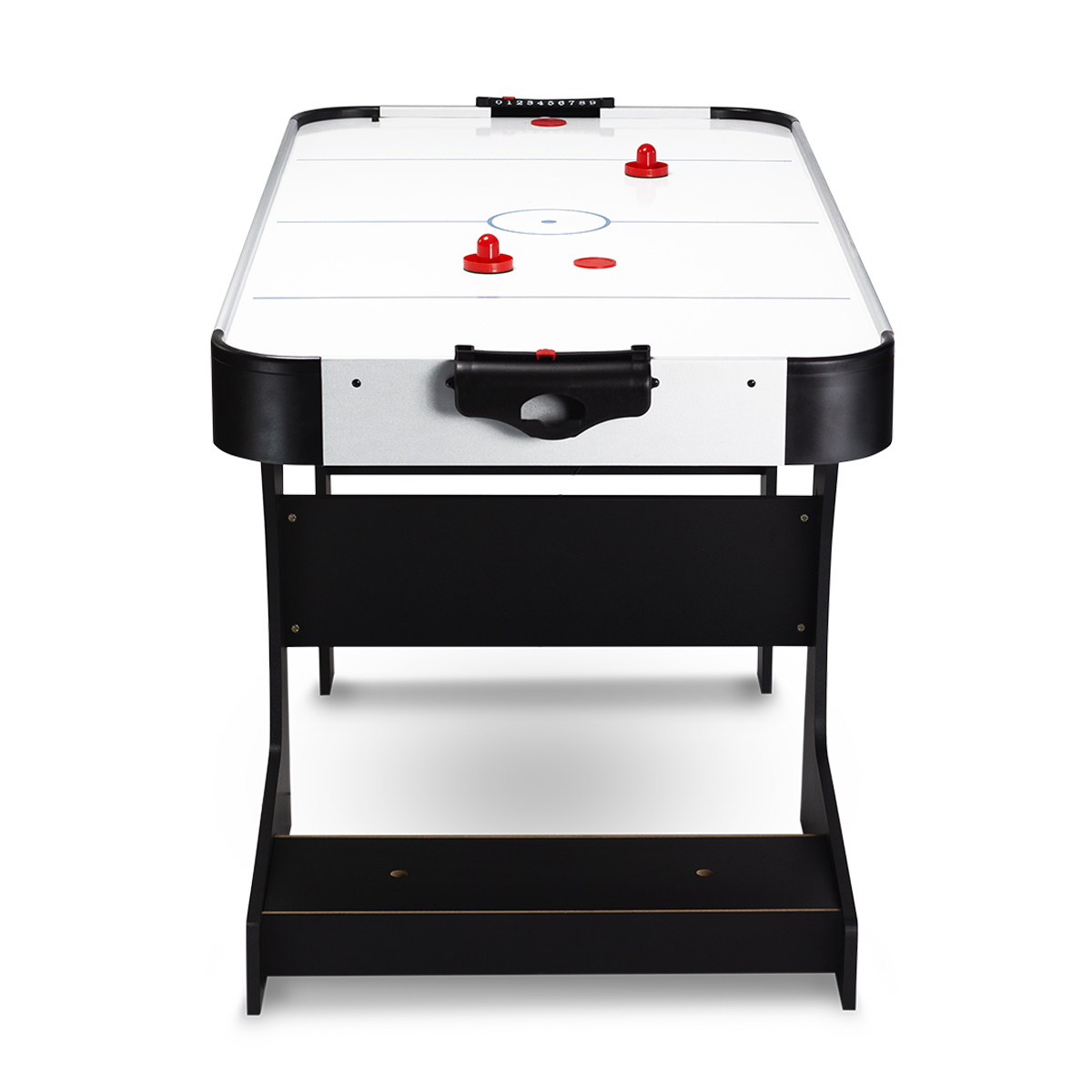 Dieser Spieltisch wurde aus hochwertiger MDF-Platte hergestellt, die abriebfest ist. Dies hängt direkt mit der langen Nutzungsdauer zusammen. Das Spielfeld ist mit den speziellen Löchern ausgestattet, durch die Luft geblasen wird. Daher kann der Puck praktisch ohne Reibungsverluste gleitet und das Spiel ist gleichzeitig dynamischer. Unter dem Tisch finden Sie auch einen leistungsfähigen Akku.