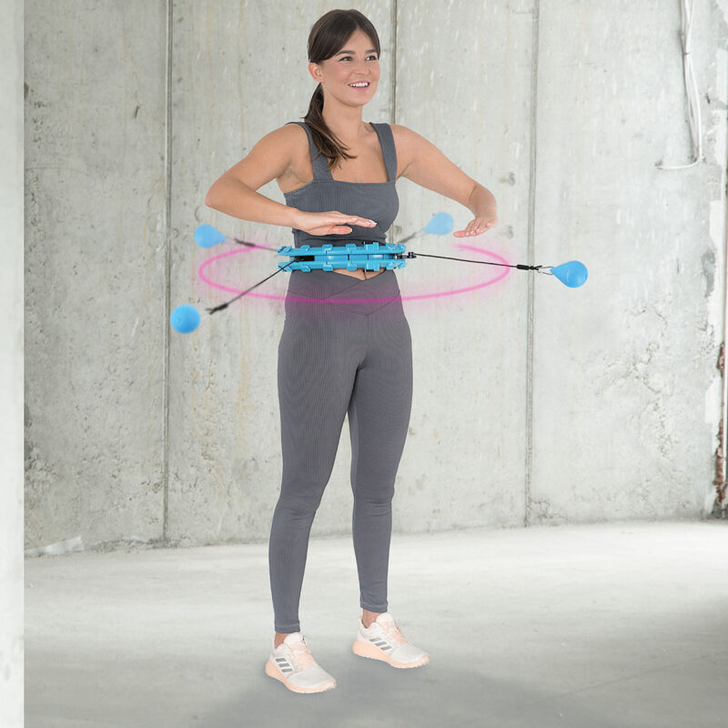 Die Funktionsweise von HHW01 ist sehr einfach und intuitiv. Es ist ein geschlossener Kreis, der eine Schiene mit einem Schwerkraftball (Belastung) hat. Beim Ausführen von Hüftkreisbewegungen beginnt die Zentrifugalkraft zu wirken, die der Schwerkraftball entlang des Kreises verschiebt und die Bauch- und Rumpfmuskeln unter Spannung setzt..