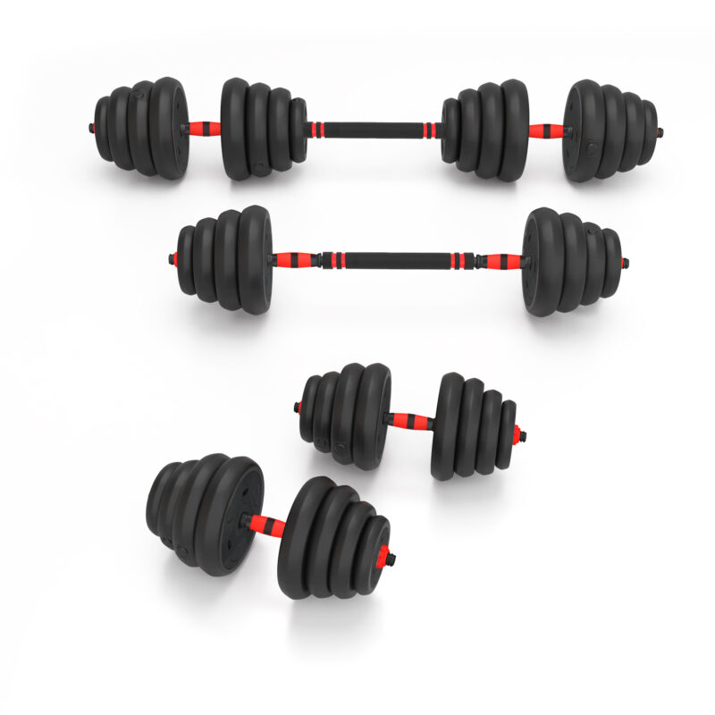 Langhantel : Verbinden Sie zwei Hantelstangen miteinander mittels eines Verbindungselements. Passen Sie die Belastung an und fangen Sie mit Ihrem Training an. Die Langhantel ermöglicht die Durchführung mehrgelenkiger Übungen wie z.B. Kniebeugen, Bankdrücken, Kreuzheben oder Stoßen. Diese Übungen beanspruchen viele Muskelgruppen gleichzeitig und führen zur Verbesserung des Gleichgewichts, der Kraft, Ausdauer und Muskelmasse.