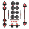 Das Set umfasst zwei Hantelstangen, vier Verschlüsse, Verbindungselement und insgesamt 16 Hantelscheiben.