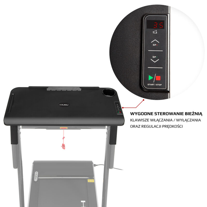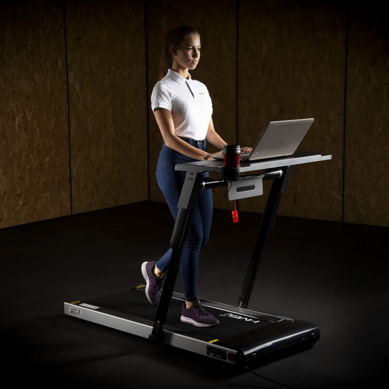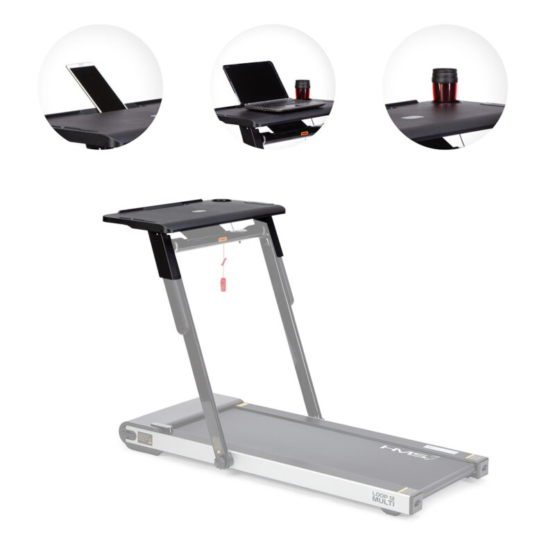 Mit diesem Produkt wird es möglich, Ihre Arbeit und körperliche Aktivität unter einen Hut zu bringen. Die Benutzung vom Laufband-Schreibtisch begrenzt die maximale Geschwindigkeit bis zum 6 km/h, daher können Sie mit Ihrem Laptop während des Joggings problemlos arbeiten. Auf dem Schreibtisch befindet sich einen Platz für eine Trinkflasche oder einen Becher sowie eine Halterung für Ihren Tablet. Mit der speziellen Systemsteuerung kann man die Geschwindigkeit jederzeit verringern oder das Laufband ausschalten. Der Schreibtisch lässt sich einfach montieren und am Laufband befestigen. Dafür braucht man nur ein Kabel. Diese Lösung ist eine ausgezeichnete Alternative für die Arbeit am klassischen Schreibtisch.