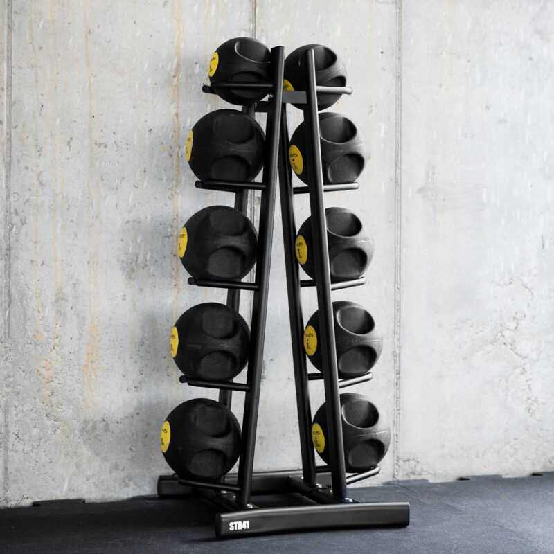 Der STR41 ist ein praktischer und kompakter Medizinballständer, mit dem Sie Ihre Trainingsgeräte organisieren und den Platz optimal nutzen können. Dank seines hohen Designs und der Kapazität für bis zu 10 Bälle mit unterschiedlichem Gewicht ist er ideal für Fitnessstudios, Fitnessstudios und Heimtrainingsbereiche.