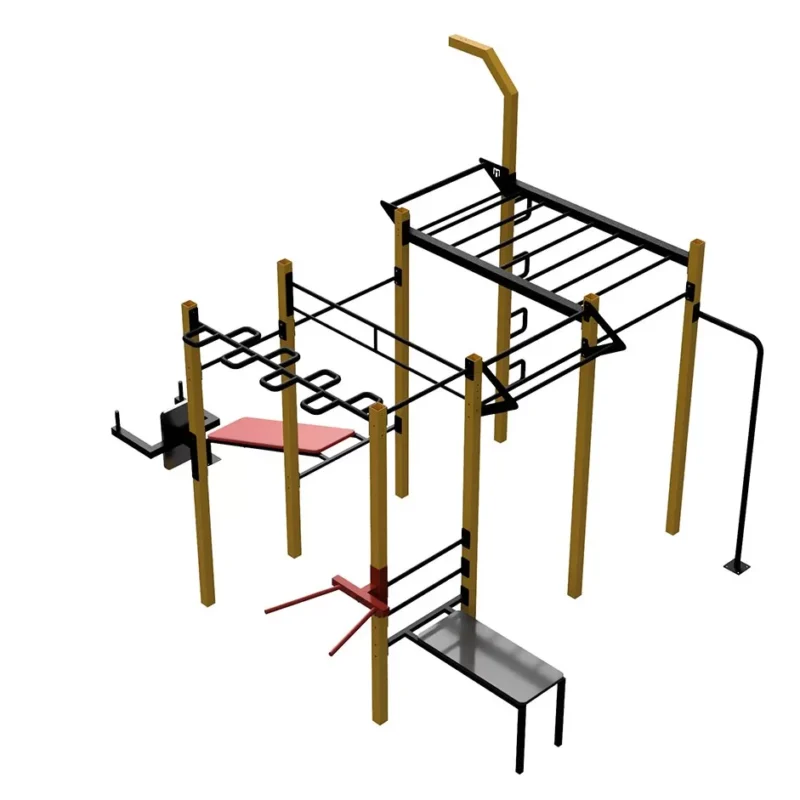 Design für anspruchsvolle Kunden. Dank einer großen Anzahl verschiedener Stangen (Doppel-, Dreifach-, SNAKE- und Leiterstange) wird das Training nie wieder langweilig. Das Design ist dank Ergänzungen wie Monster ABS (Bauchmuskeln), einer geraden und geneigten Bank, Handläufen für schwedische Liegestütze, Seitenschienen und einem Kletterseil auf das Ganzkörpertraining ausgerichtet. Die Struktur sieht 14 Stationen vor, die ein Gruppentraining ermöglichen.